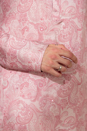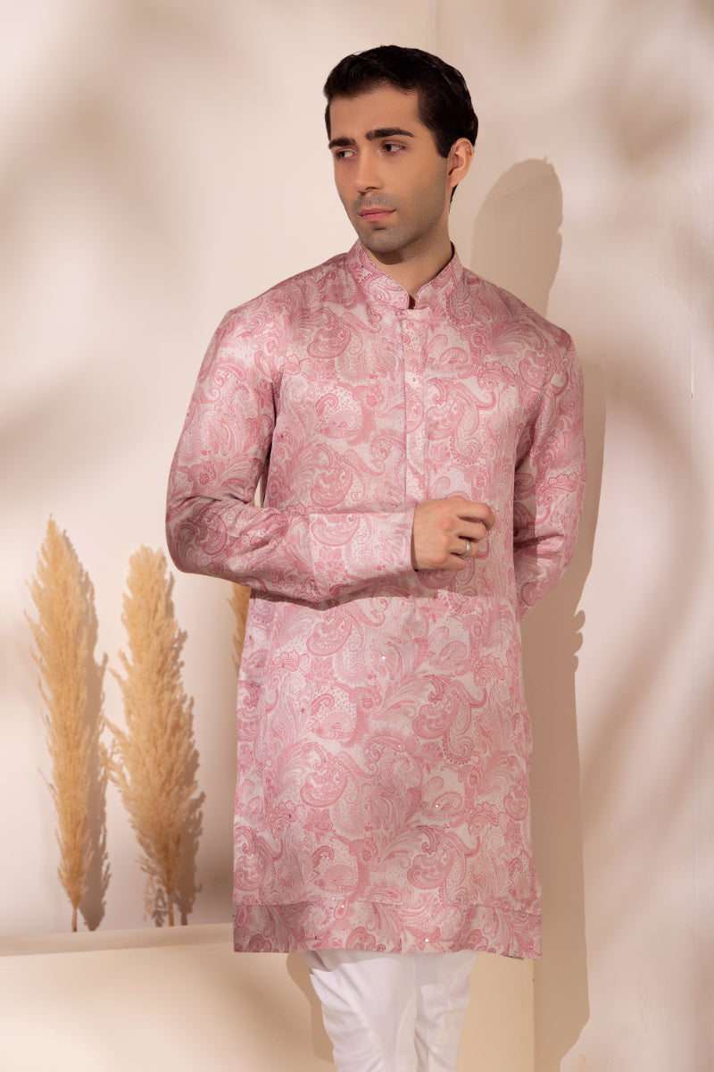 Understated charm meets contemporary grace in this blush pink kurta, crafted in soft sheen silk and adorned with an all-over paisley print. Designed for the modern man who appreciates refined aesthetics, the print blends traditional inspiration with a fresh pastel palette that feels light and celebratory.
