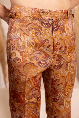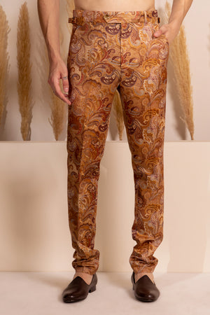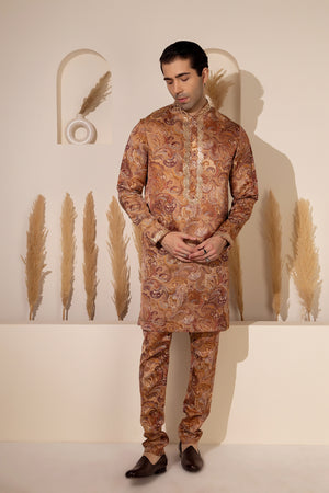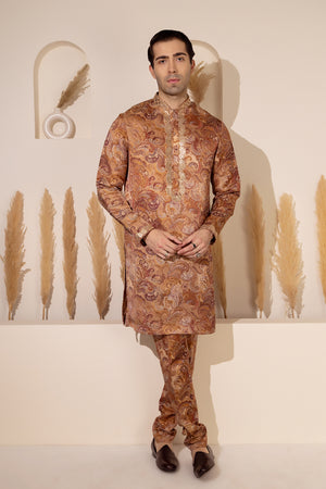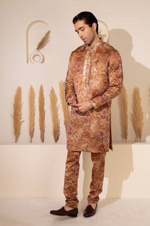 Amberwood Paisley Kurta Set – a head-to-toe celebration of craft and color. Featuring a statement paisley motif in warm, opulent shades of amber, copper, and gold, this two-piece ensemble is designed for those who command attention with subtle elegance.