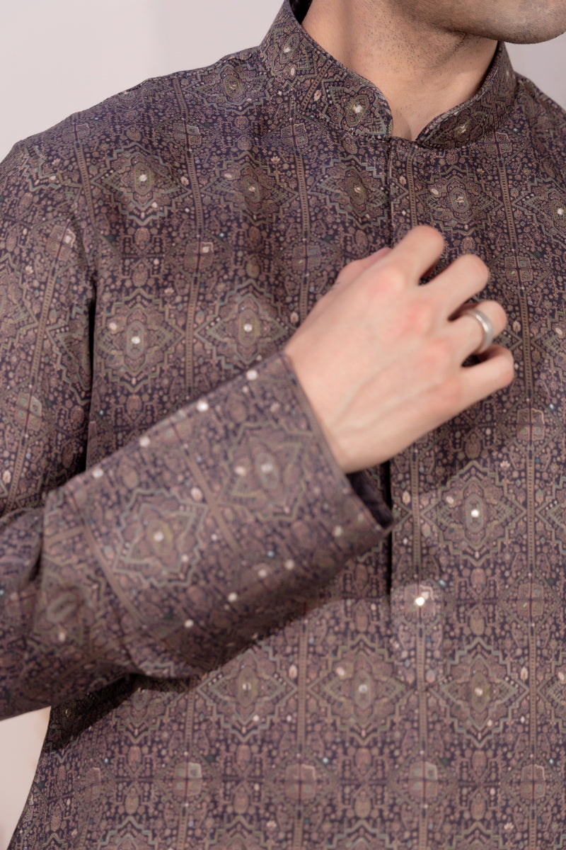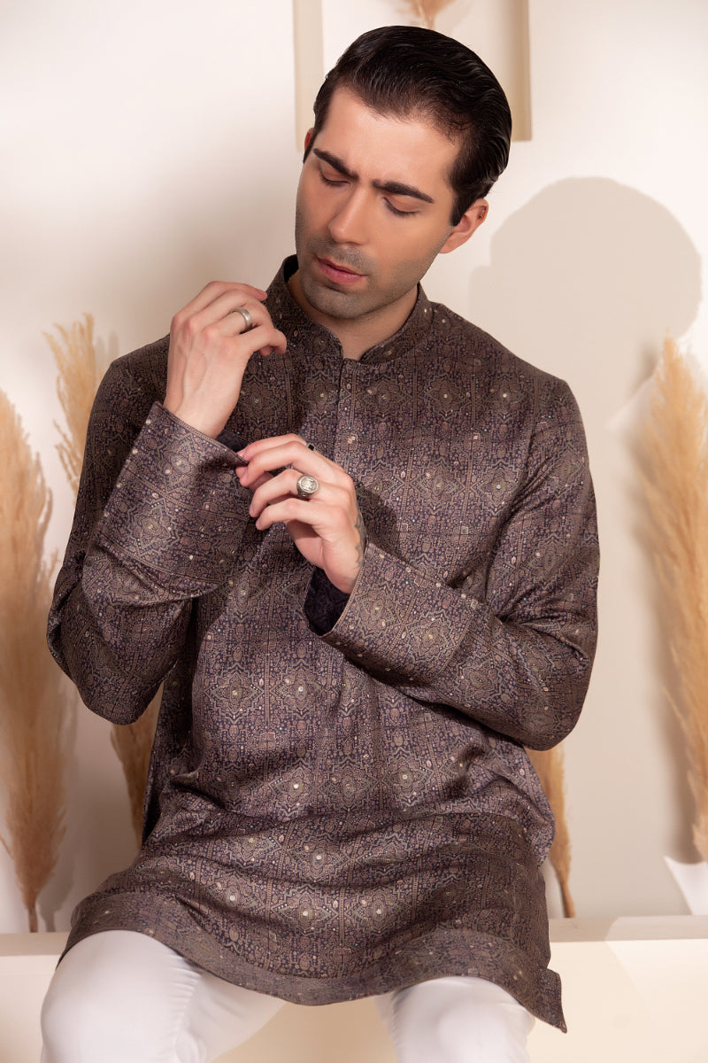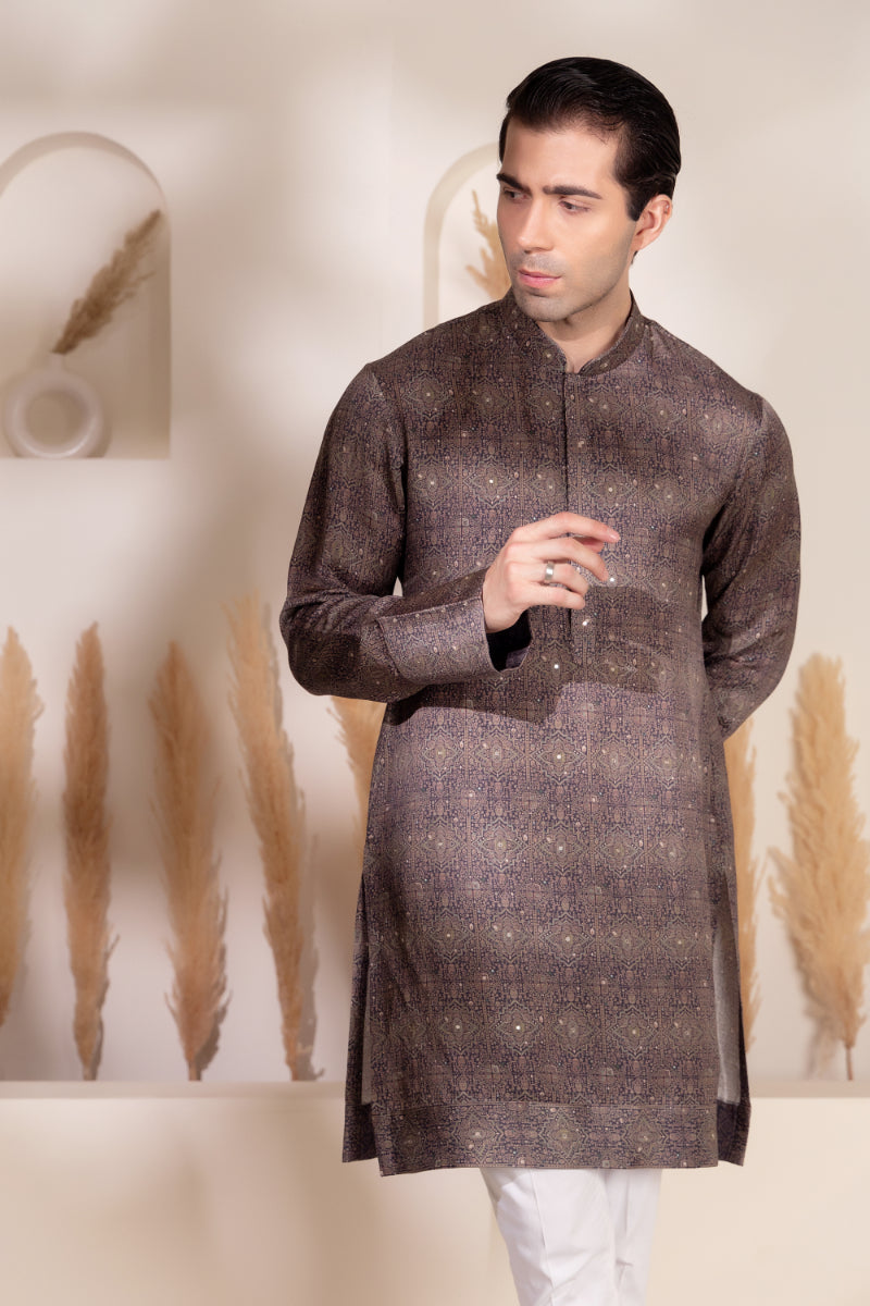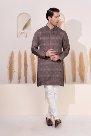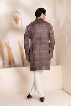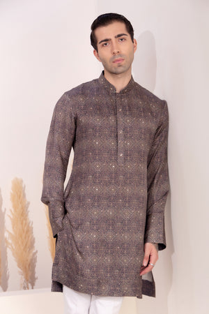 Minimal yet impactful, this charcoal-toned kurta features a muted geometric print inspired by traditional tile motifs, crafted in soft sheen silk that catches the light with subtle elegance. Ideal for evening gatherings or festive dinners, the design strikes a balance between heritage and modern-day sophistication.