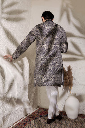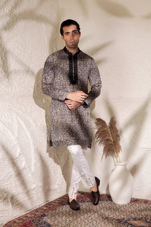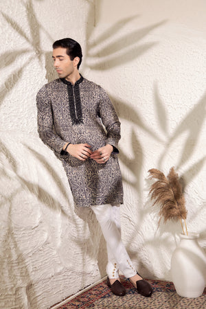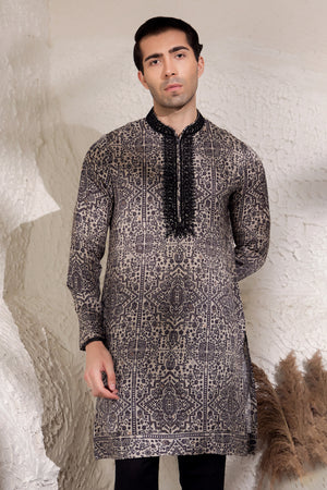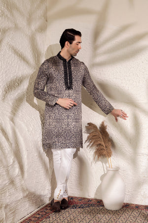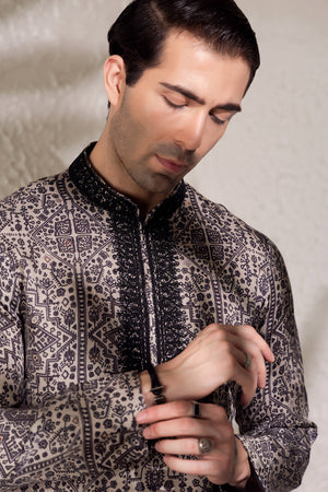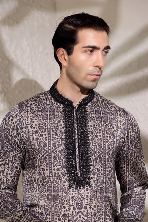 Make a statement with the Naqshdar Threadwork Kurta, designed with a distinctive all-over pattern in beige and black that draws inspiration from traditional tile and carpet motifs. The intricate geometric print creates a visually rich surface, while the contrasting black threadwork on the placket adds texture and depth.