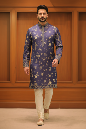 Midnight Blue Floral Heritage Kurta showcases refined elegance with an all-over delicate floral and botanical motif rendered in soft gold tones. Set on a rich midnight blue base, this kurta features a classic mandarin collar, an intricately detailed contrast placket, and coordinated cuffs and hem borders that elevate its traditional appeal. A timeless piece ideal for festive occasions and cultural celebrations.