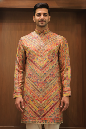 Heritage Chevron Tapestry Kurta showcases intricate chevron and geometric motifs in warm hues of rust, mustard, blue, and earthy tones. Crafted from premium linen silk, it features a structured mandarin collar, clean placket, and refined cuffs, making it an elegant choice for festive occasions and cultural celebrations.