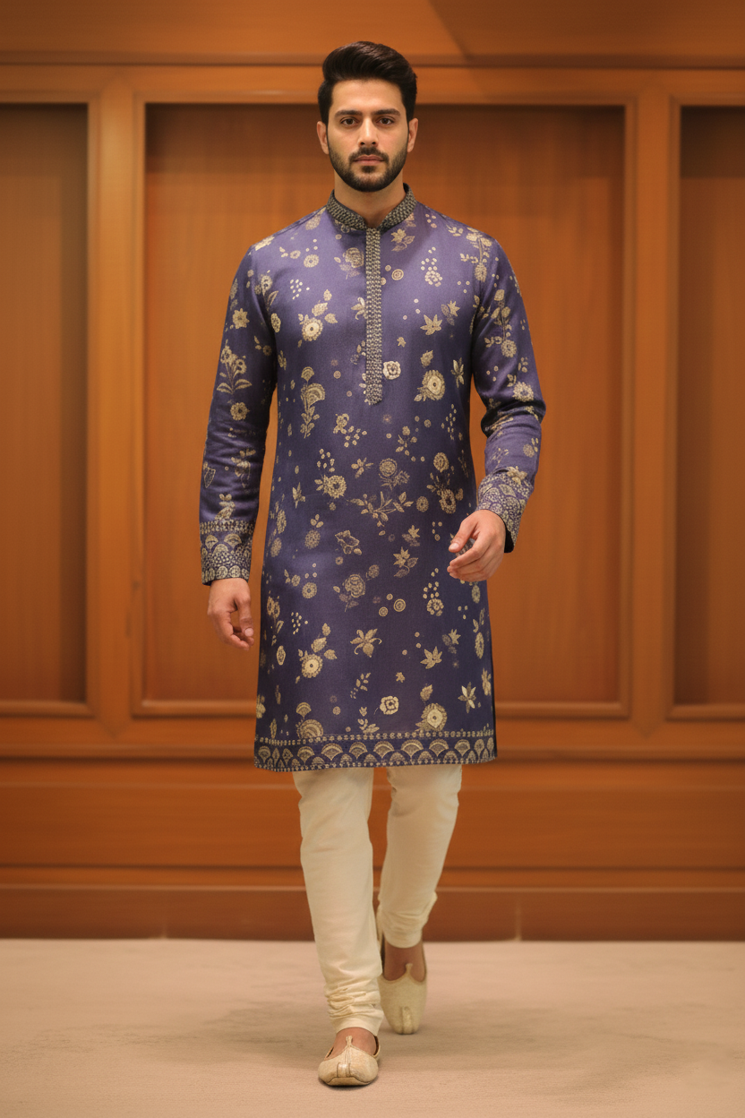 Midnight Floral Heritage Kurta is an elegant blend of tradition and refinement, adorned with delicate floral and botanical motifs in soft gold tones on a deep indigo base. Crafted from premium linen silk, it offers a graceful drape with detailed collar, cuffs, and hem, making it ideal for festive and cultural occasions.