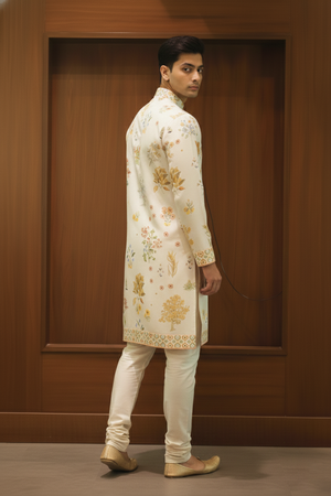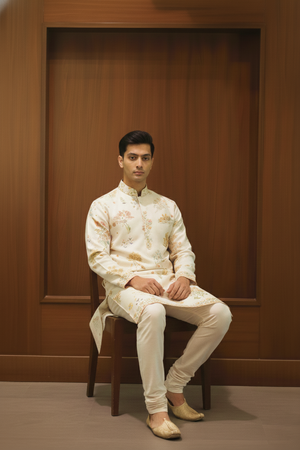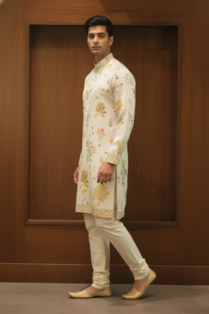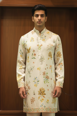 Ivory Botanical Garden Kurta showcases timeless elegance with an all-over botanical floral print in soft, earthy hues on an ivory base. Crafted from premium linen silk, it offers a refined drape and breathable comfort. Finished with a neat mandarin collar, detailed cuffs, and patterned hem, it is perfect for festive and traditional occasions.