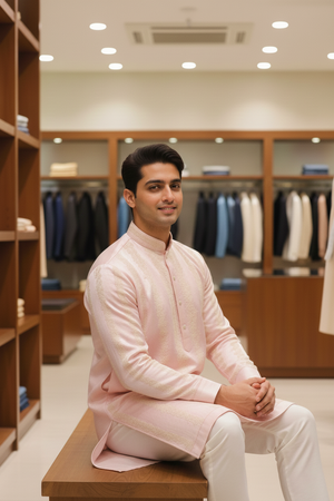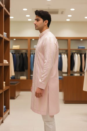 Blush Linen Silk Kurta exudes refined elegance with subtle vertical woven detailing on a soft linen silk base. Designed with a classic mandarin collar and tonal button placket, this kurta offers a lightweight, breathable feel, making it ideal for festive gatherings and elegant traditional occasions.
