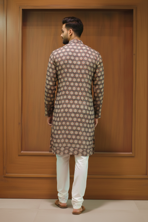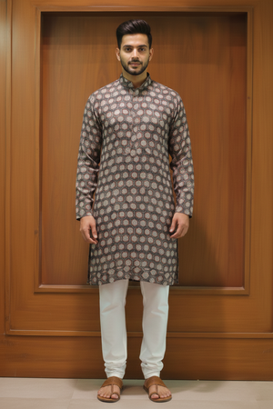 Brown Geometric Linen Silk Kurta showcases a refined all-over circular geometric print on a rich brown linen silk base with subtle earthy accents. Designed with a classic mandarin collar and clean placket, this kurta offers breathable comfort and understated elegance—ideal for festive gatherings and sophisticated traditional occasions.