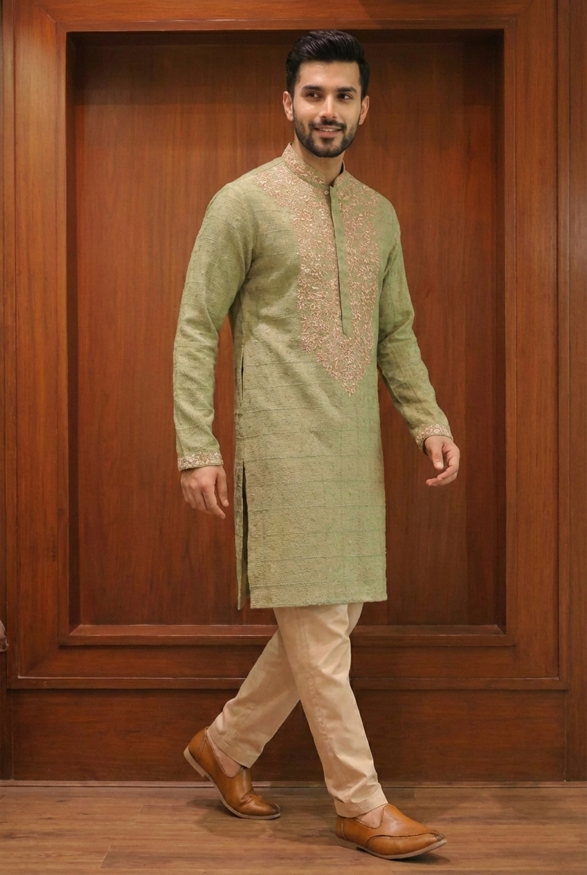 Sage Green Cotton Embroidered Kurta showcases refined craftsmanship with intricate tonal embroidery highlighting the front panel on a textured cotton base. Finished with a classic mandarin collar and subtle button placket, this kurta blends comfort with elegance, making it ideal for festive occasions and traditional gatherings.