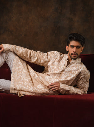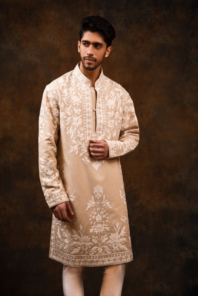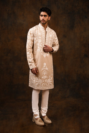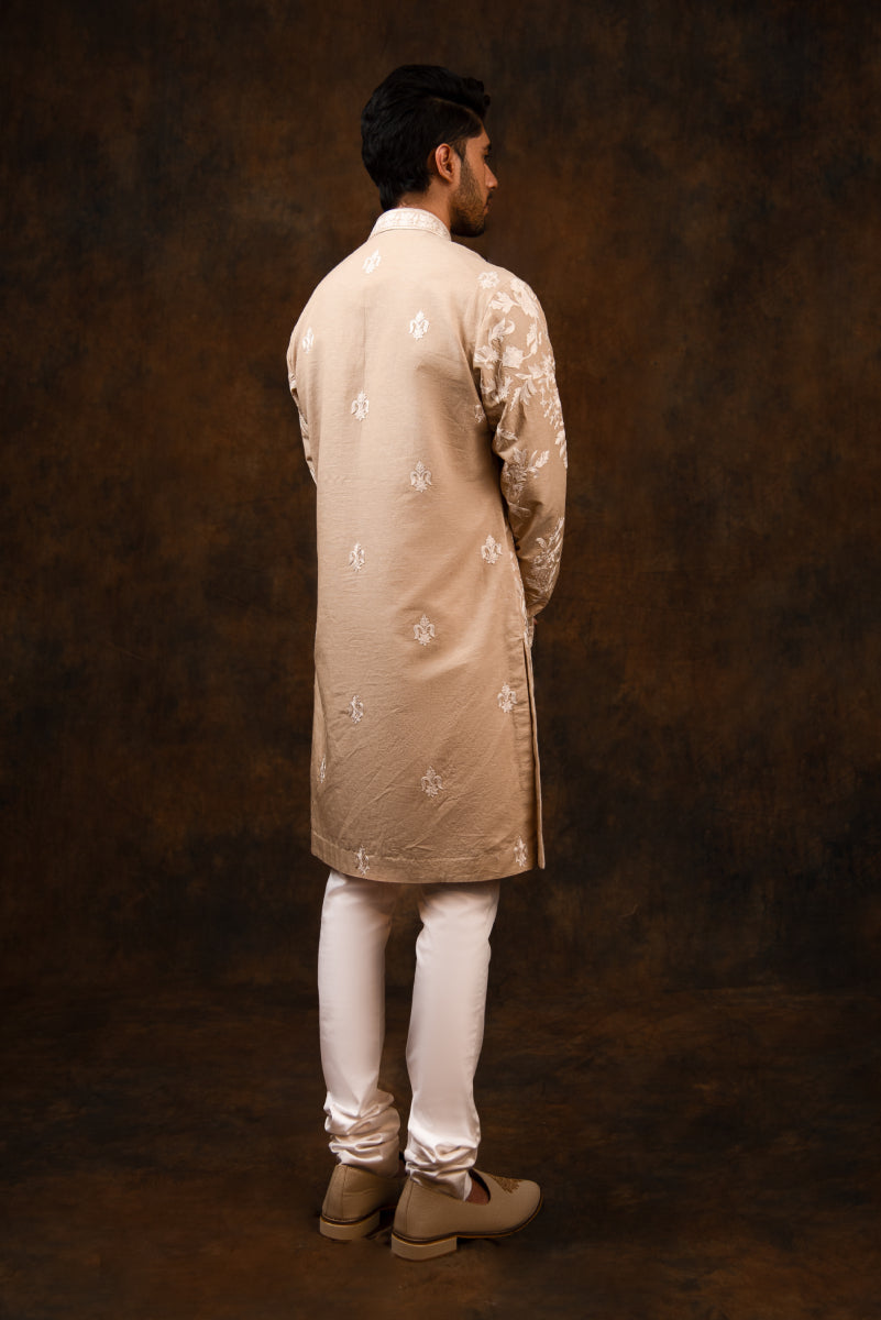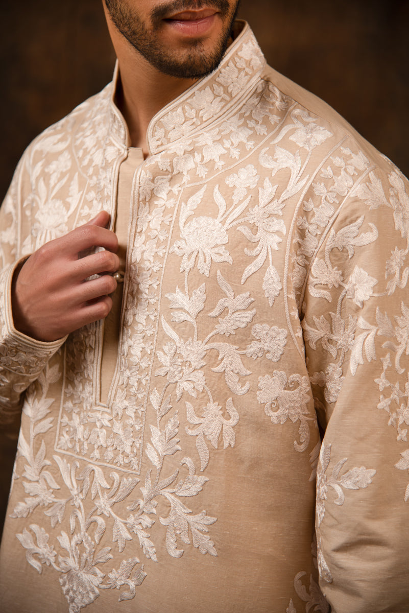 Beige Bloom Linen Silk Kurta showcases a unique floral kashmiri aari embroidery with an unconventional placement that distinguishes it from other garments. The intricate combination of floral motifs on the cuffs, bottom, and yoke, along with parallel kashmiri aari work, adds a textural element to its design. On the back, detailed signage embroidery is thoughtfully positioned, lending an unexpected twist that enhances the kurta's refined elegance.