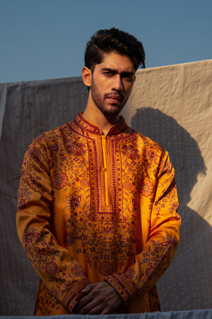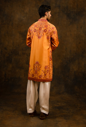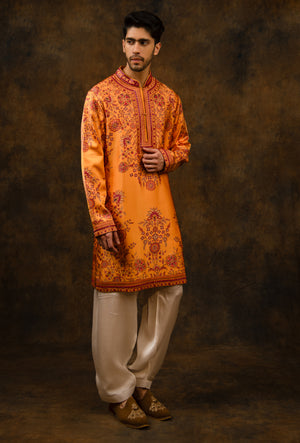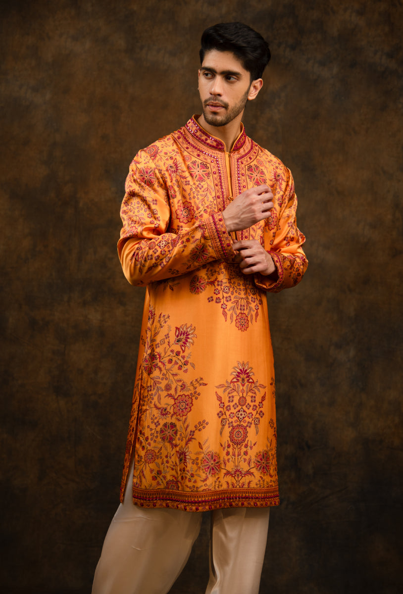 Saffron Orange Kurta adorned with a stunning floral digital print that exudes charm and energy. Intricate mirror embellishments, thoughtfully placed, bring a unique flair to the design. The harmonious blend of shimmer and rich detailing makes this kurta a standout choice for special occasions.
