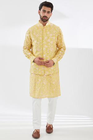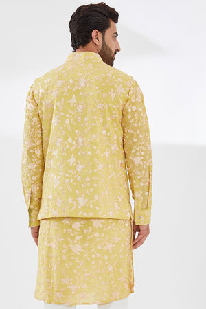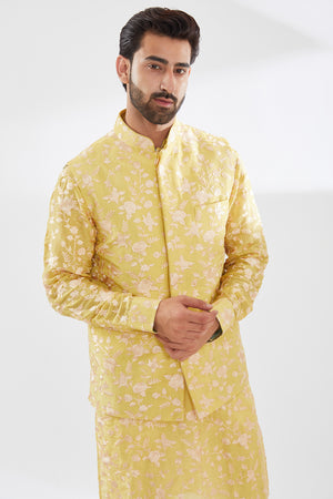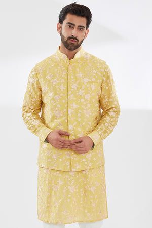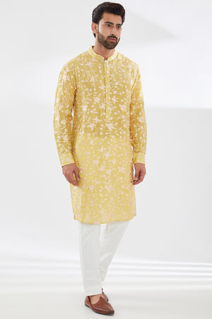 Yellow Parsi Gara Embo. Unlined Silk Kurta W Beige Pant