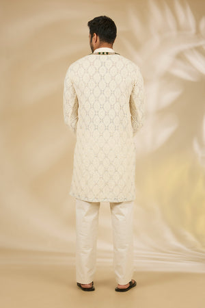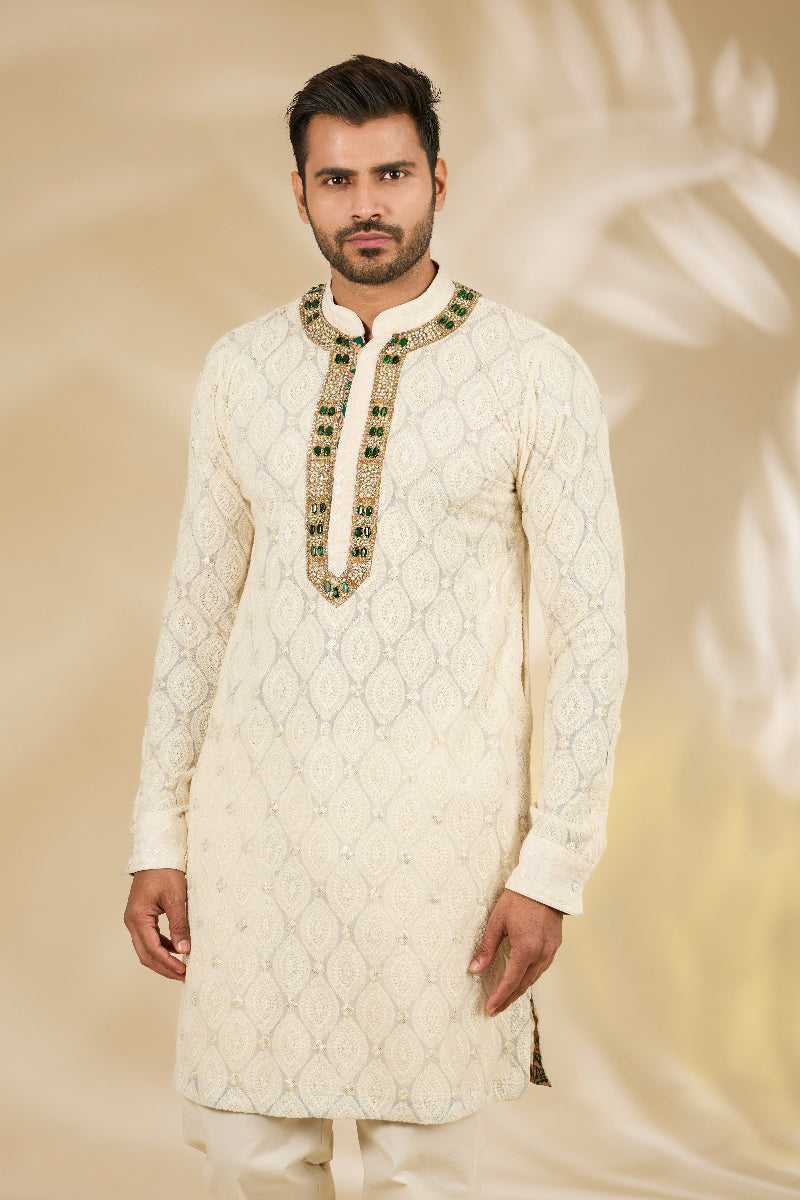 Off white Gorgette Leaf Thread Work Unlined Kurta W Green Stone Hand Work Neck Line W Print Detailing W Cotton Silk Pant