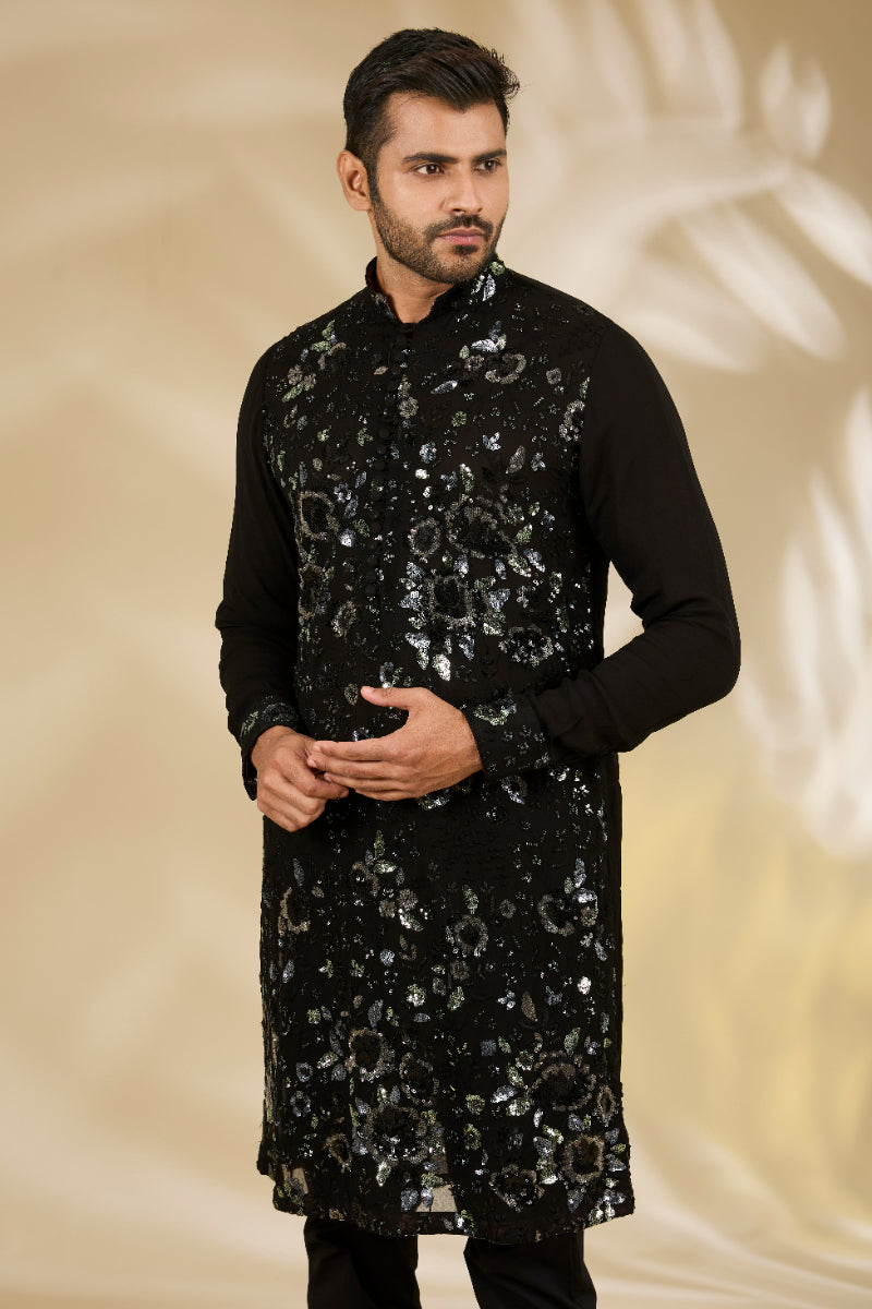 Black Goregtte Front Sequin +Thread / Back & Sleeevs Plain Gorgette W Gorgtte Lined Kurtaw Print Touch W Cotton Silk Pant