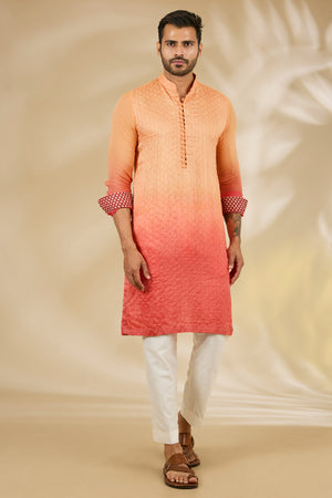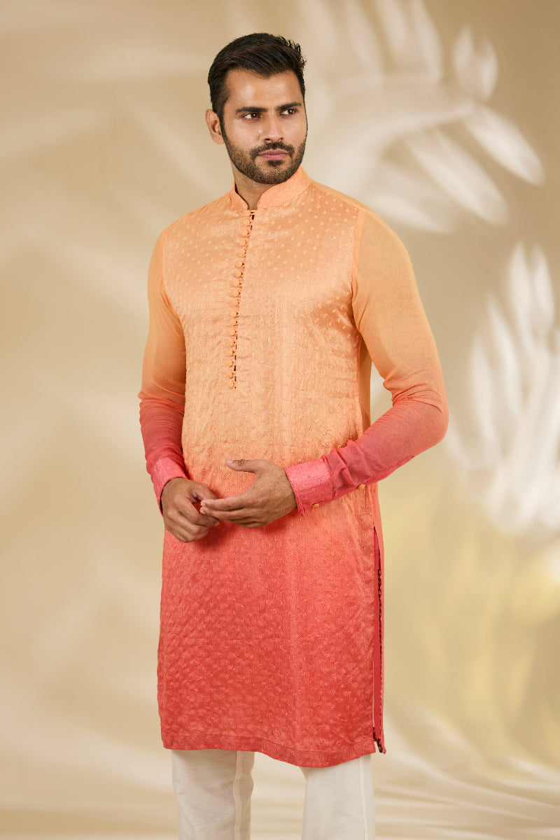 Sahded Orange To Peach Front Thred Booti Silk W Plain Gorgtte Sleeves , Back Unlined Kurta W Loop Button W Print Detailing W Cotton Silk Pant