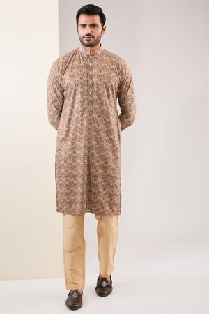 Pale Peach georgette Both Side Printed Kurta W Front Gorgette Sequin , Back & Slvees Crepe W Gold Cotton Silk Pant