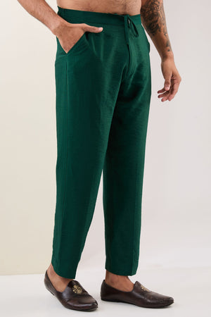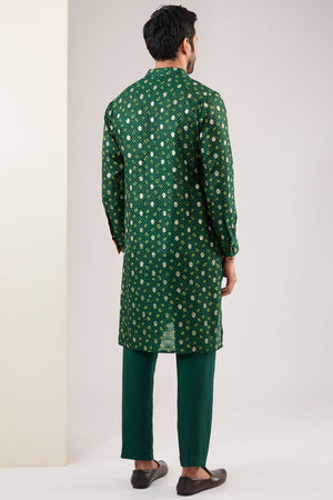 Emrald Green W Silver Zari Booti + Sequin Bandhini Unlined Kurta W Yellow Bandhini Detailing On Collar, Cuff & Placket W Matching Cotton Silk Pant