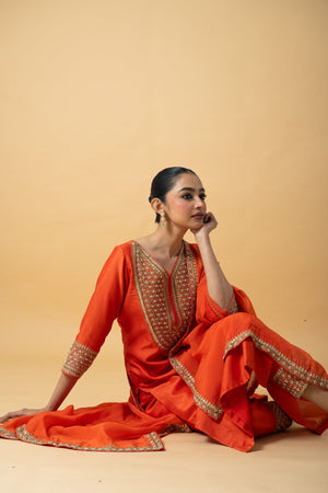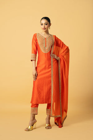 Orange Chanderi Silk 3 Quarter Sleeve Kurta Salwar With Hand Embroidery & Organza Dupatta With Hand Embroidery . Hand Embroidery Consists Moti , Cutdana , Gota Patti Etc