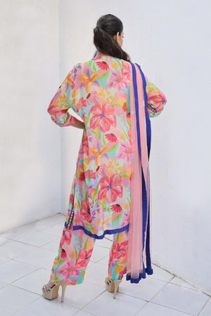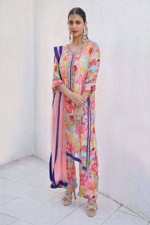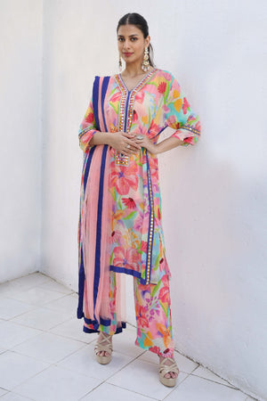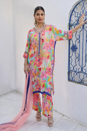Printed Kurta Set Made From Premium Georgette Fabric. The Set Consists Of Kurta With Embroidered Neckline And Sleeve Hem Paired With Straight Pants And Net Dupatta.