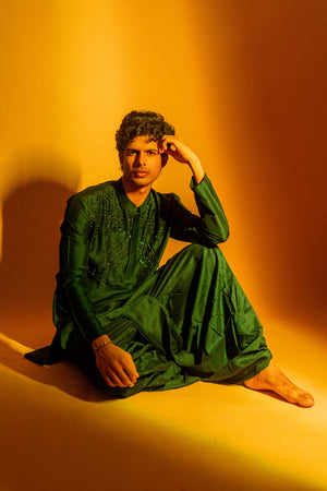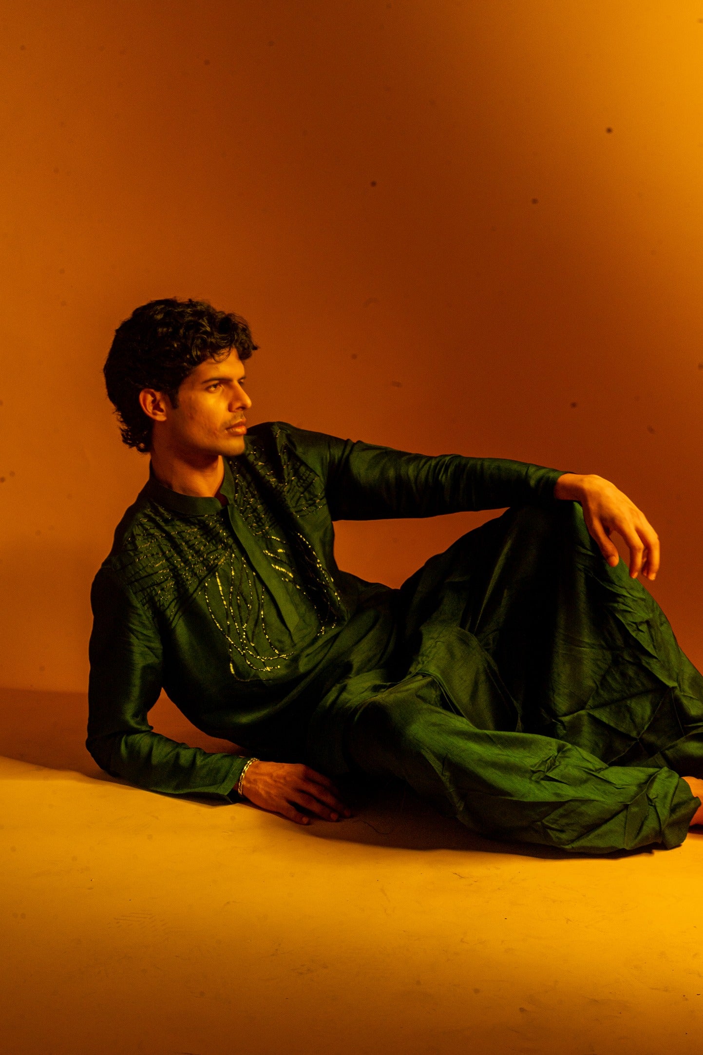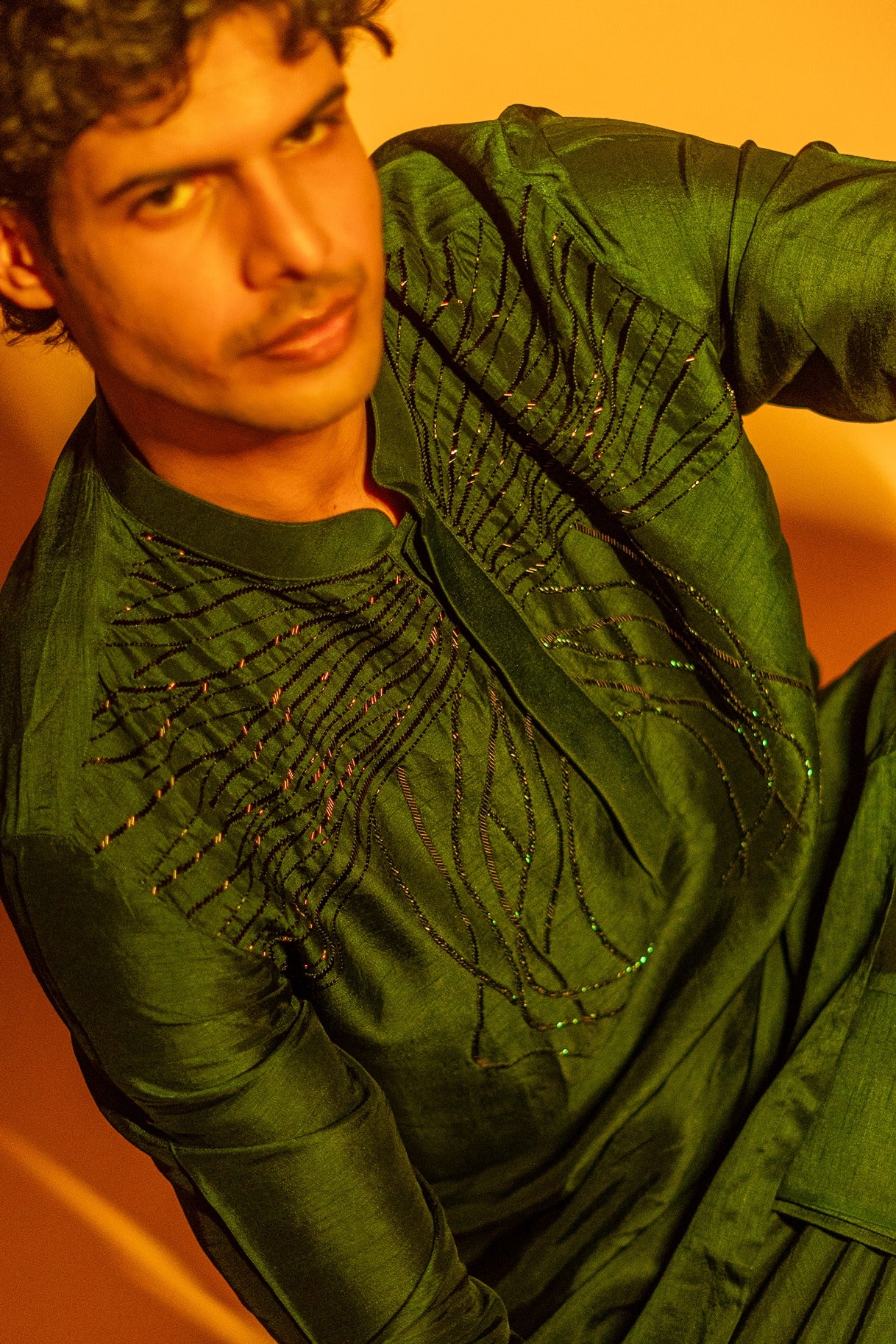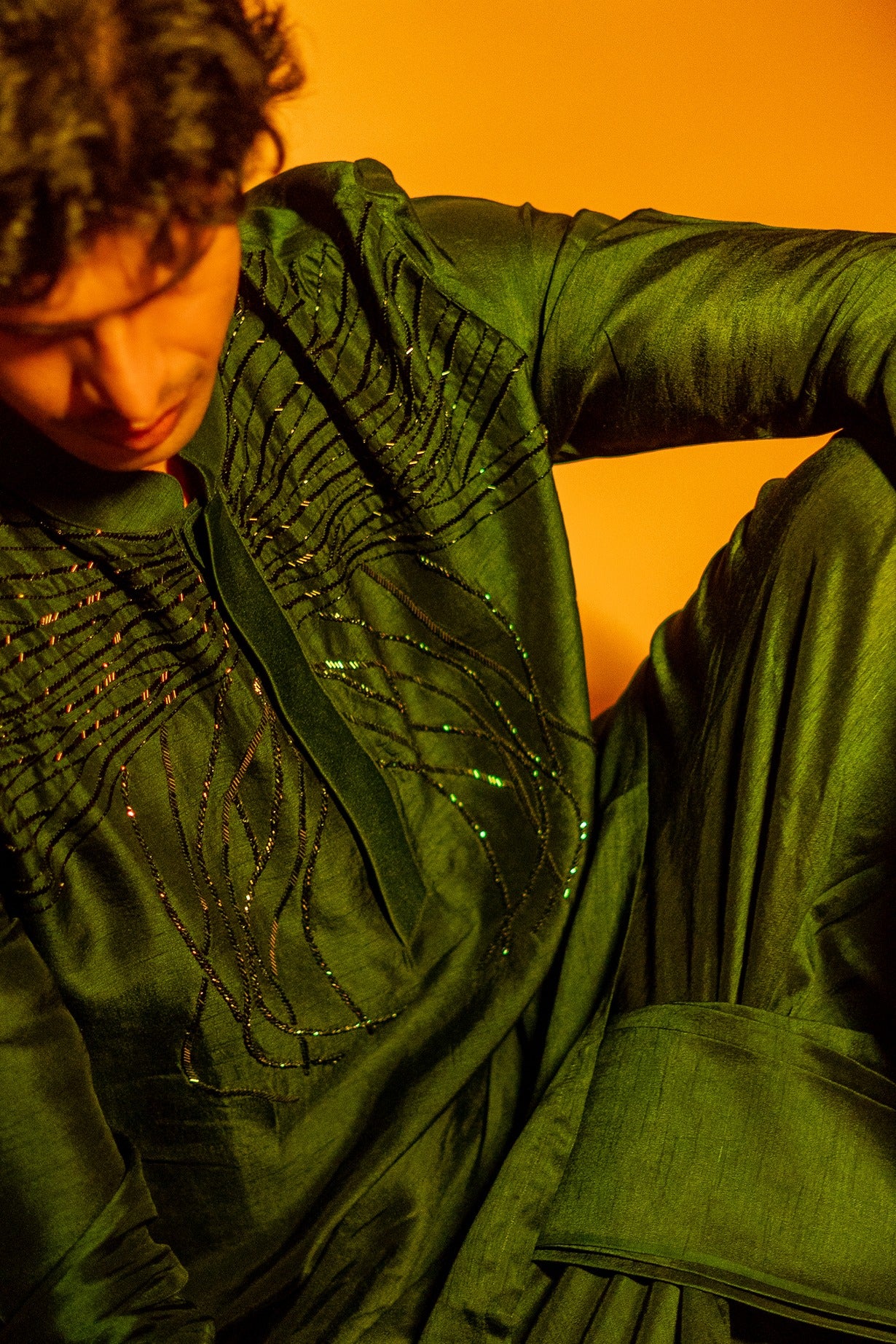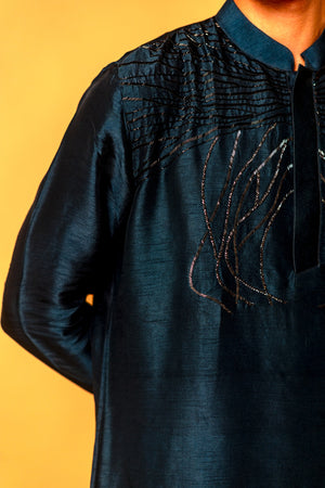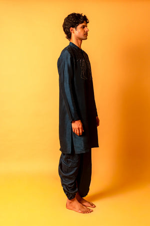 A Mid- night blue kurta–dhoti set defined by its rich hue and refined craftsmanship. The kurta is meticulously embroidered, lending a subtle yet luxurious finish.