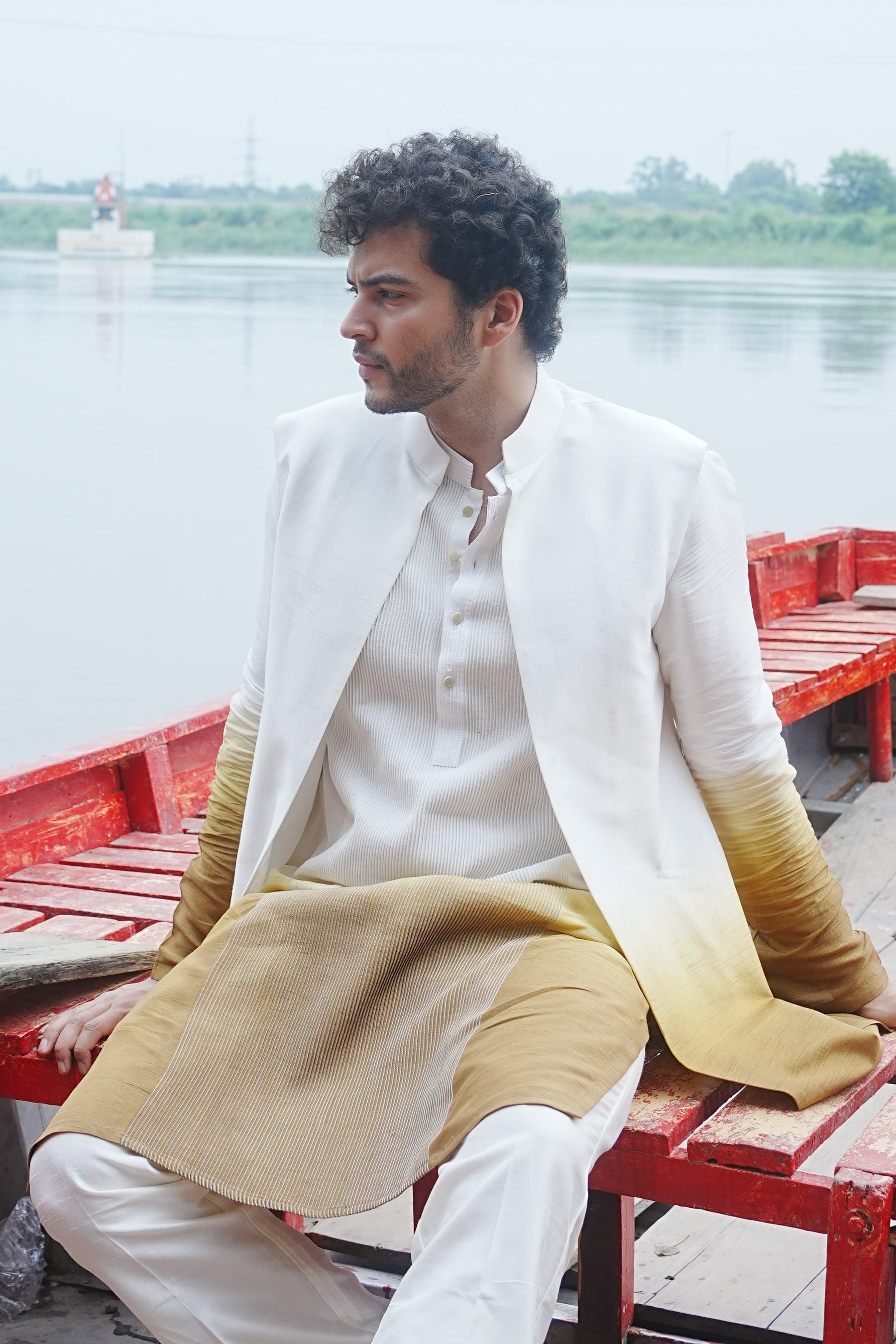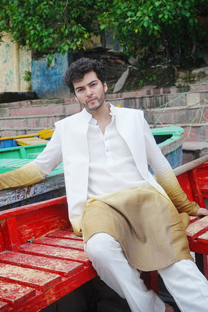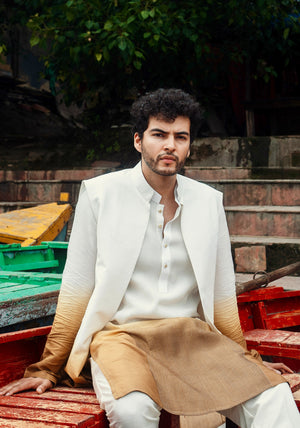 A statement ombre kurta adorned with precise pin-tuck detailing running from top to bottom, paired with off-white pants and elevated with a coordinating ombre jacket, creating a refined and distinctly luxurious silhouette