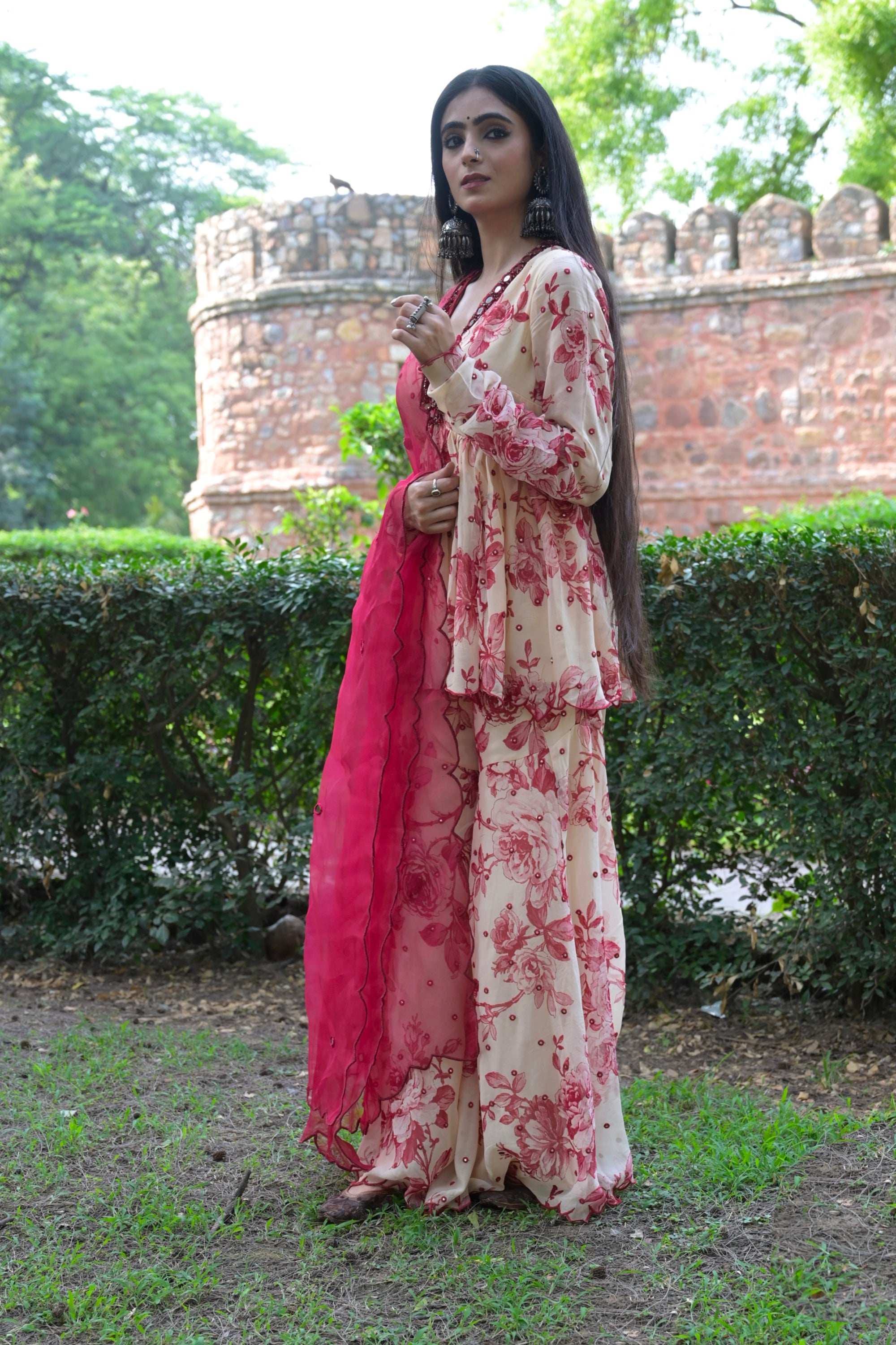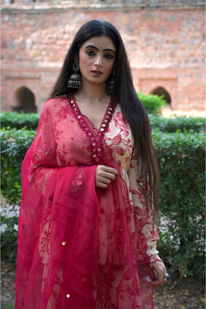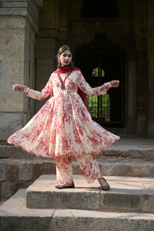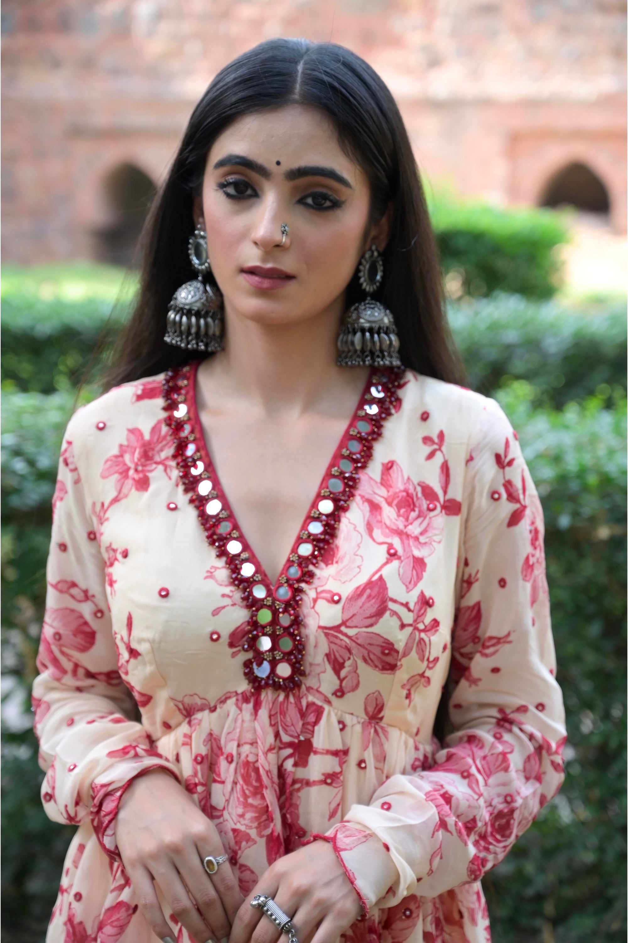 Ecru printed georgette anarkali with mirrors and embellished neckline paired with straight pants and silk organza dupatta with scallop embroidery and mirrors.