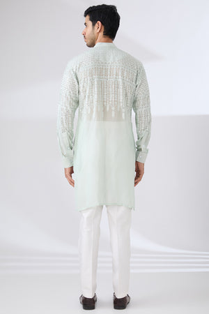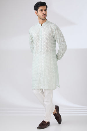 Sage Green Gorgette Unlined Kurta Fully Front Tonal Embo. W Back Half Embo. Wpant
