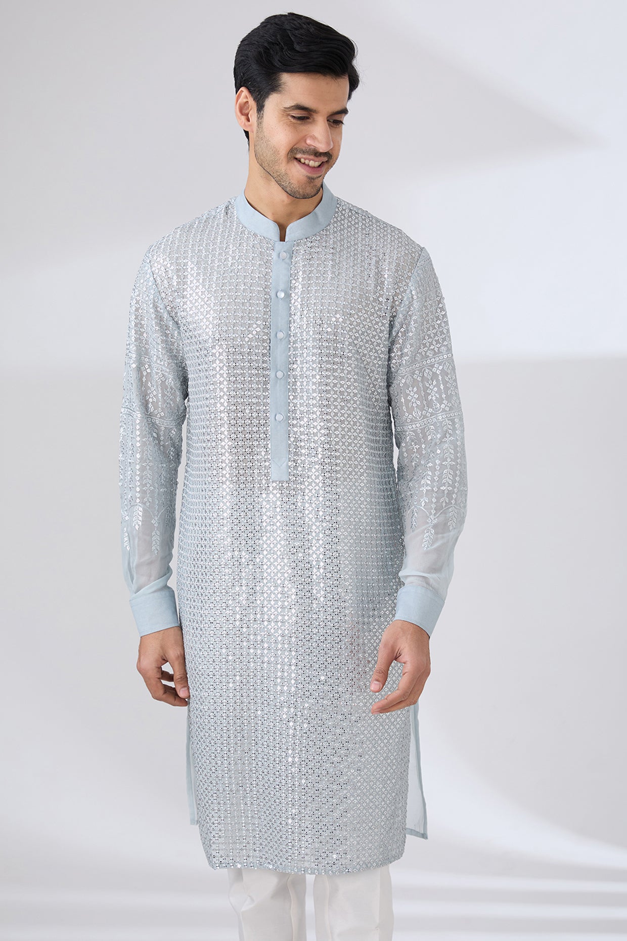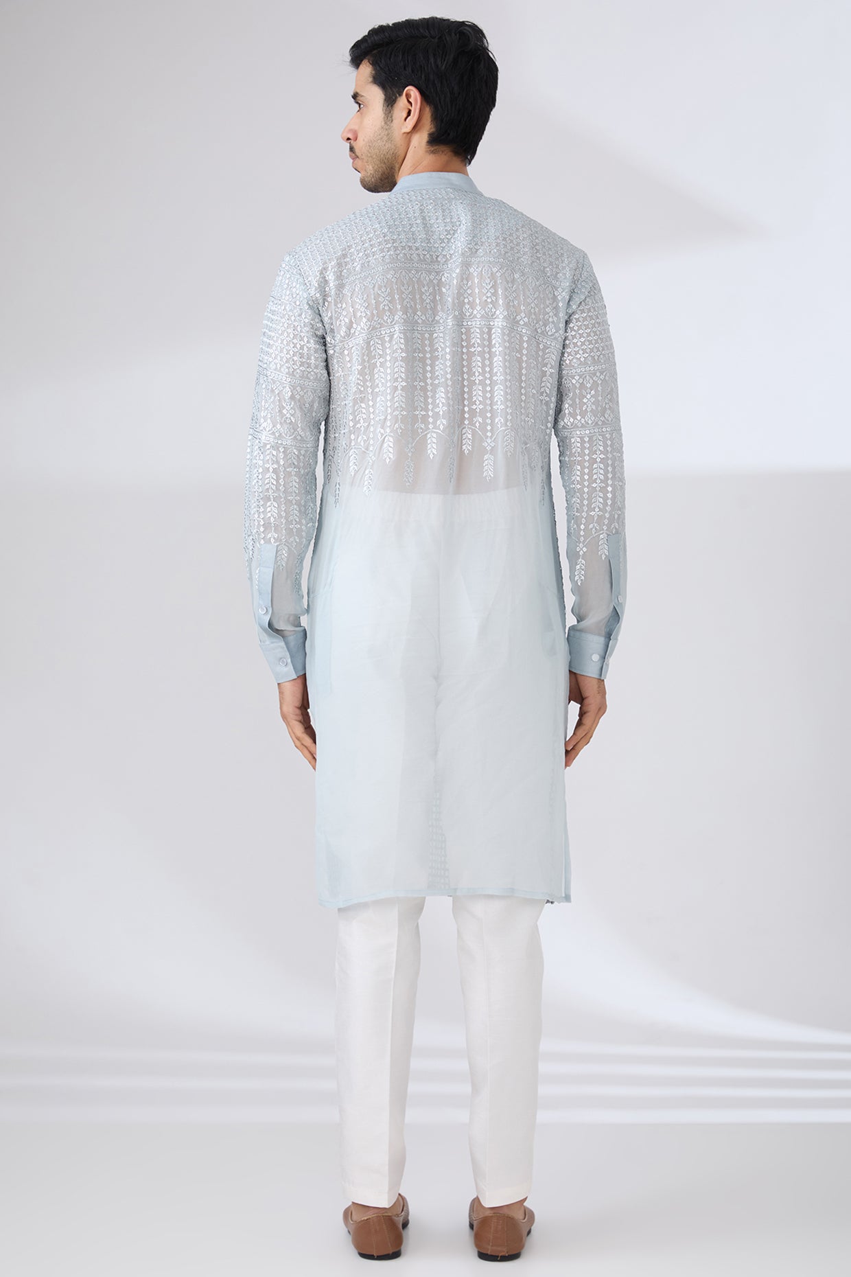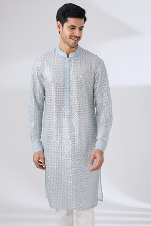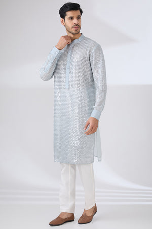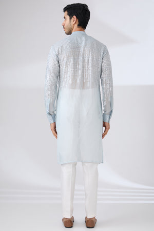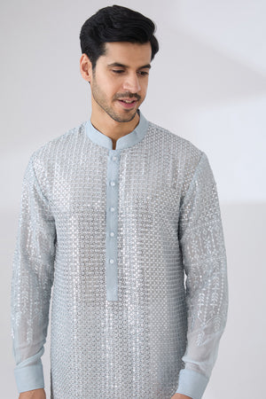 Grey Gorgette Unlined Kurta Fully Front Silver Embo. W Back Half Embo. Wpant