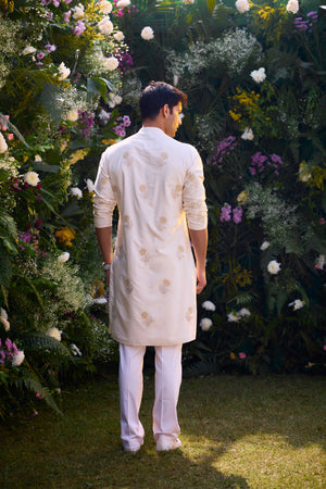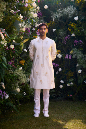 Pristine white cotton silk gold and silver lurex patch work and thread embroidered kurta set
