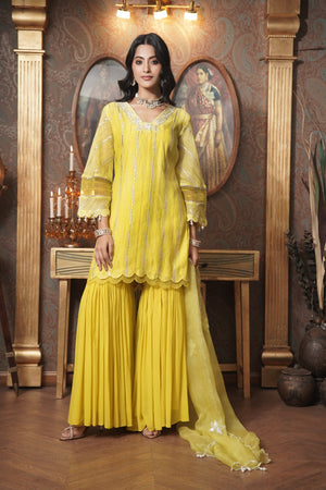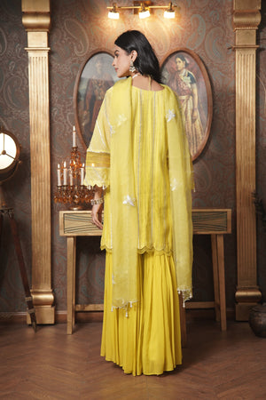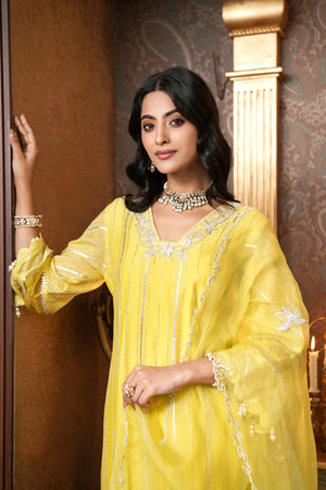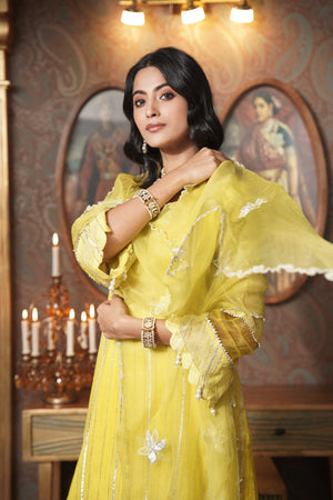 Introducing the Lime Zoya Kurta Set, featuring a stunning glass neckline and elegant A-line sleeves crafted from luxurious gota fabric. This exquisite ensemble showcases delicate organza cutwork on the neck and organza detailing on the sleeves, adding a refined touch. Paired with a stylish garara and a matching organza dupatta adorned with intricate booties, this set perfectly blends contemporary charm with traditional elegance, making it ideal for any festive occasion.