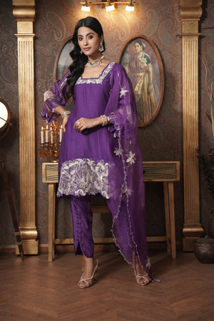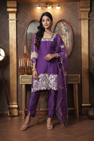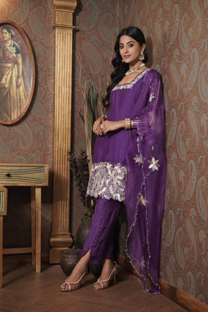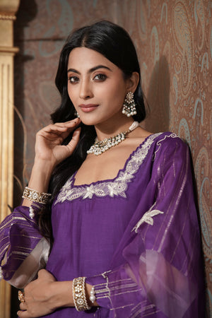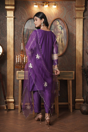 Introducing the Deep Violet Charm Kurta Set, featuring a stunning glass neckline with elegant organza cutwork on the kurta. Crafted from mul chanderi, the kurta is paired with soft muslin pants and a luxurious organza dupatta adorned with floral patchwork and zari booties. This ensemble beautifully combines traditional charm with modern sophistication, perfect for festive occasions.