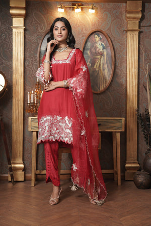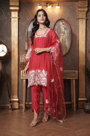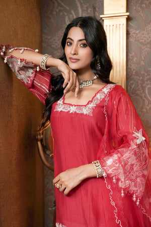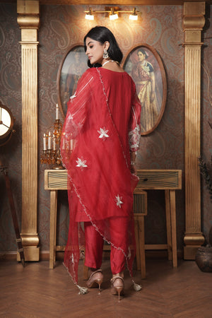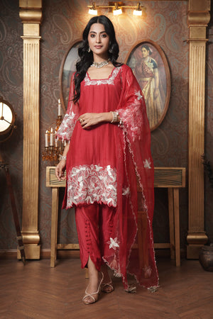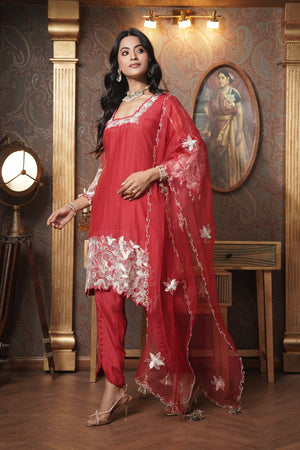ntroducing the Ruby Kiss Kurta Set, featuring a stunning glass neckline with elegant organza cutwork on the kurta and sleeves. Crafted from mul chanderi, the kurta is paired with soft muslin pants and a luxurious organza dupatta adorned with floral patchwork and zari booties. This ensemble beautifully combines traditional charm with modern sophistication, perfect for festive occasions.