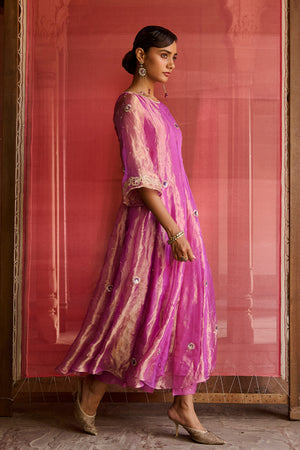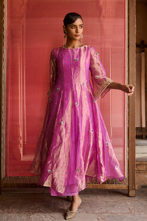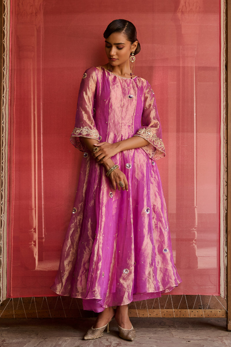 Featuring a dual tone purple tissue suit set with embellished sleeves and floral motifs all over. It is paired with cotton satin pants with hand embroidery at the hem. It is paired with a full length organza dupatta with hand embroidered motifs .