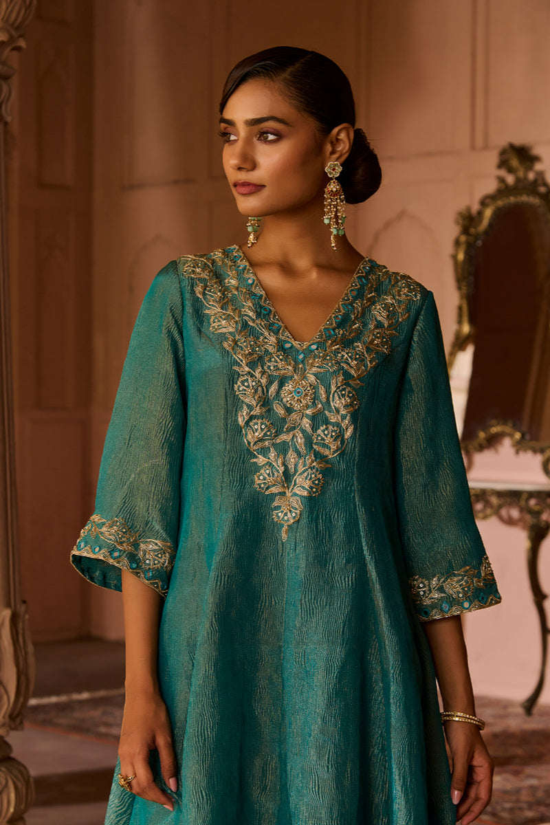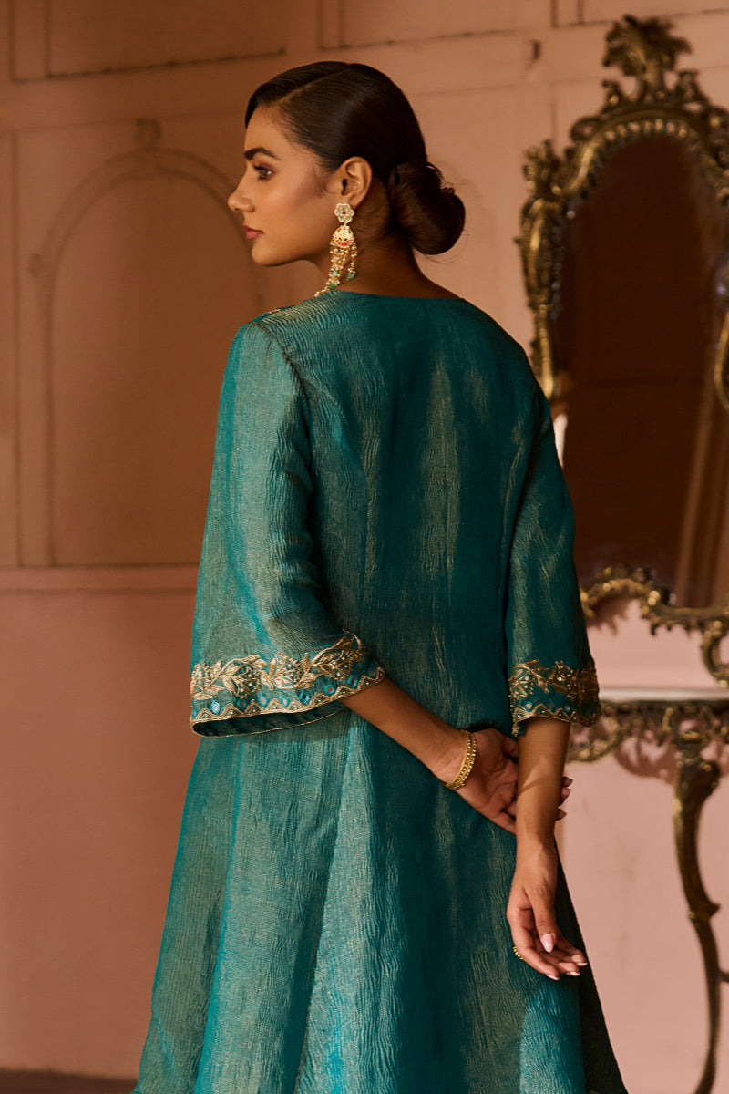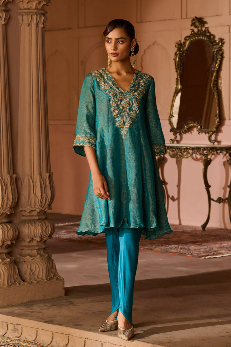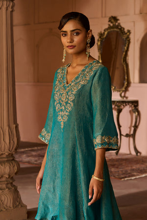 Featuring a peacock blue colour crushed tissue kurta with intricate neckline embroidery and embroidered border on sleeves adorned with mirror work. It is paired with tulip pants in satin georgette fabric. Comes with a full length dupatta in organza with hand embellishment all over .