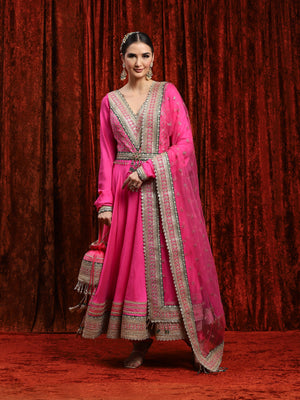 Immerse yourself in the opulent charm of our kush pink silk chanderi anarkali suit, accentuated with vibrant green detailing for a modern twist. Embellished with exquisite gota, dori, badla and kasab work, this ensemble exudes opulence. Paired with a luxurious net duppata and churidar, it offers a complete traditional look. To elevate the silhouete, a belt feturing delicate tassel detailing cinches the waist, adding a graceful flourish to one's look.
