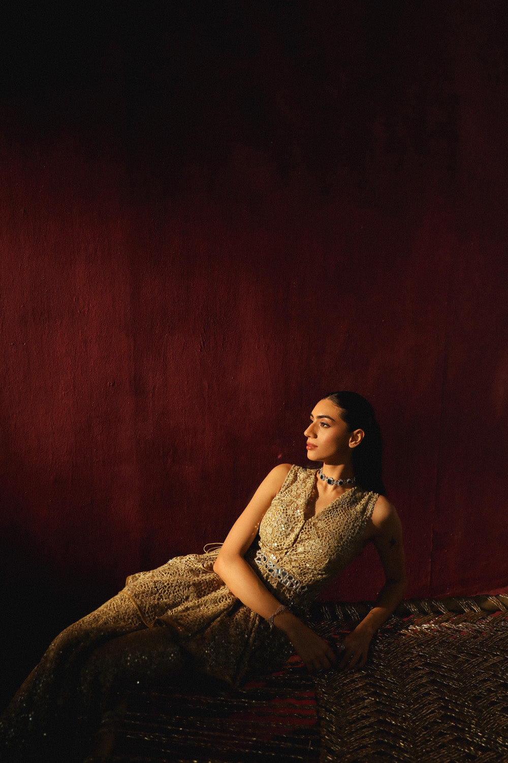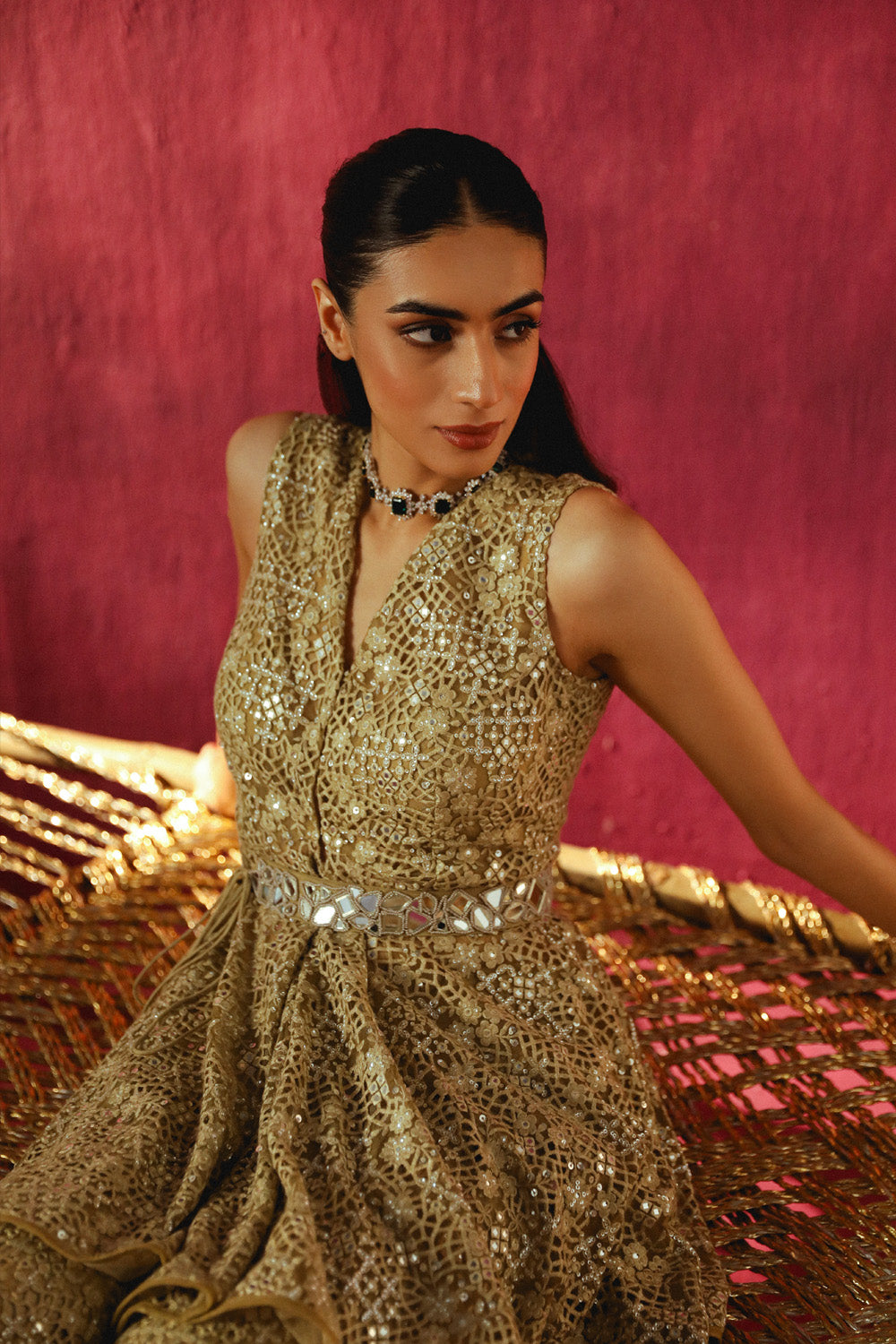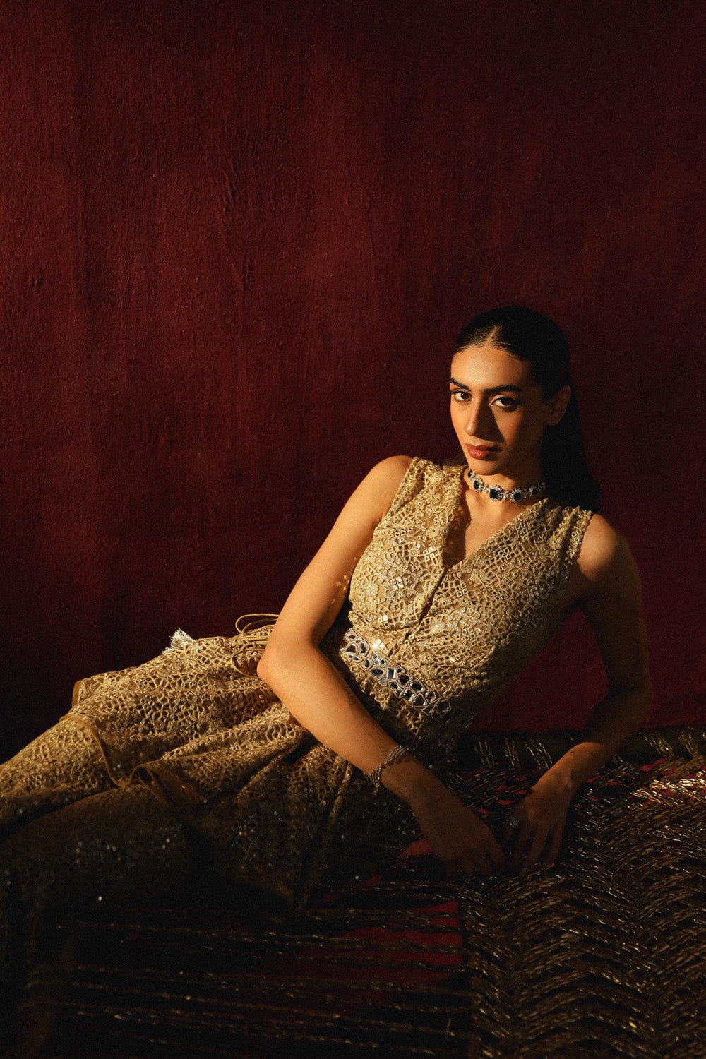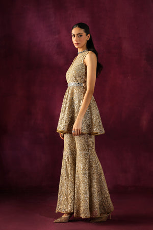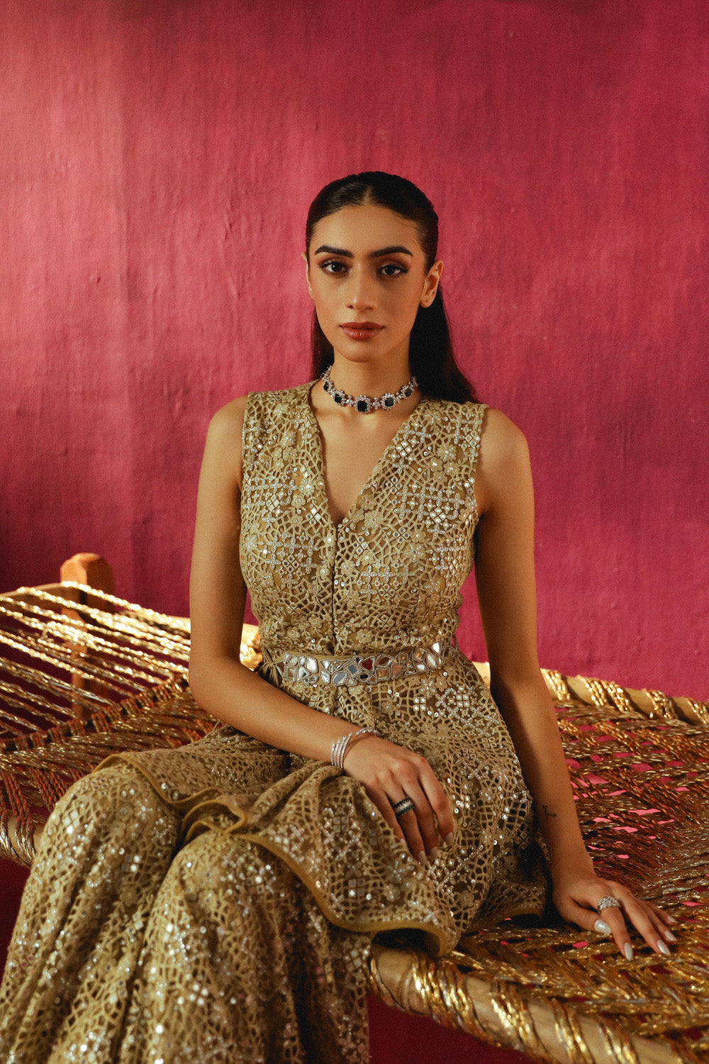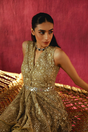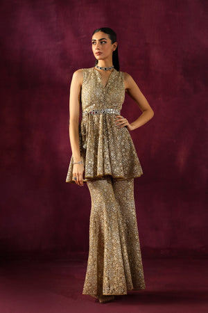 Lace Mirrorwork Back Slit Peplum jacket with Hand Embroidered Mirrorwork Belt