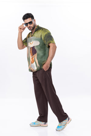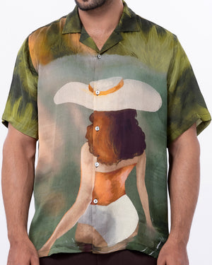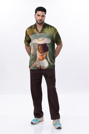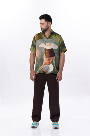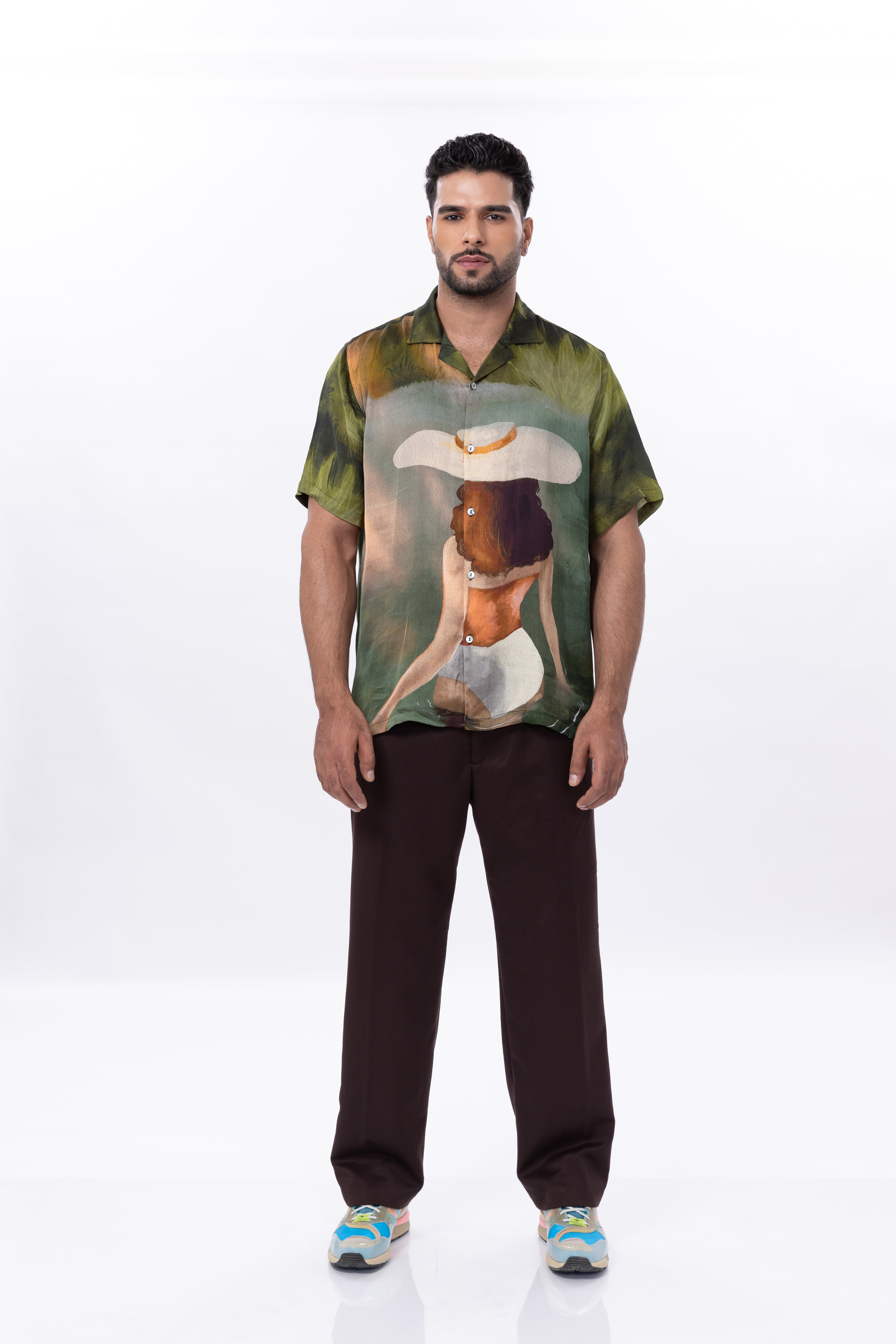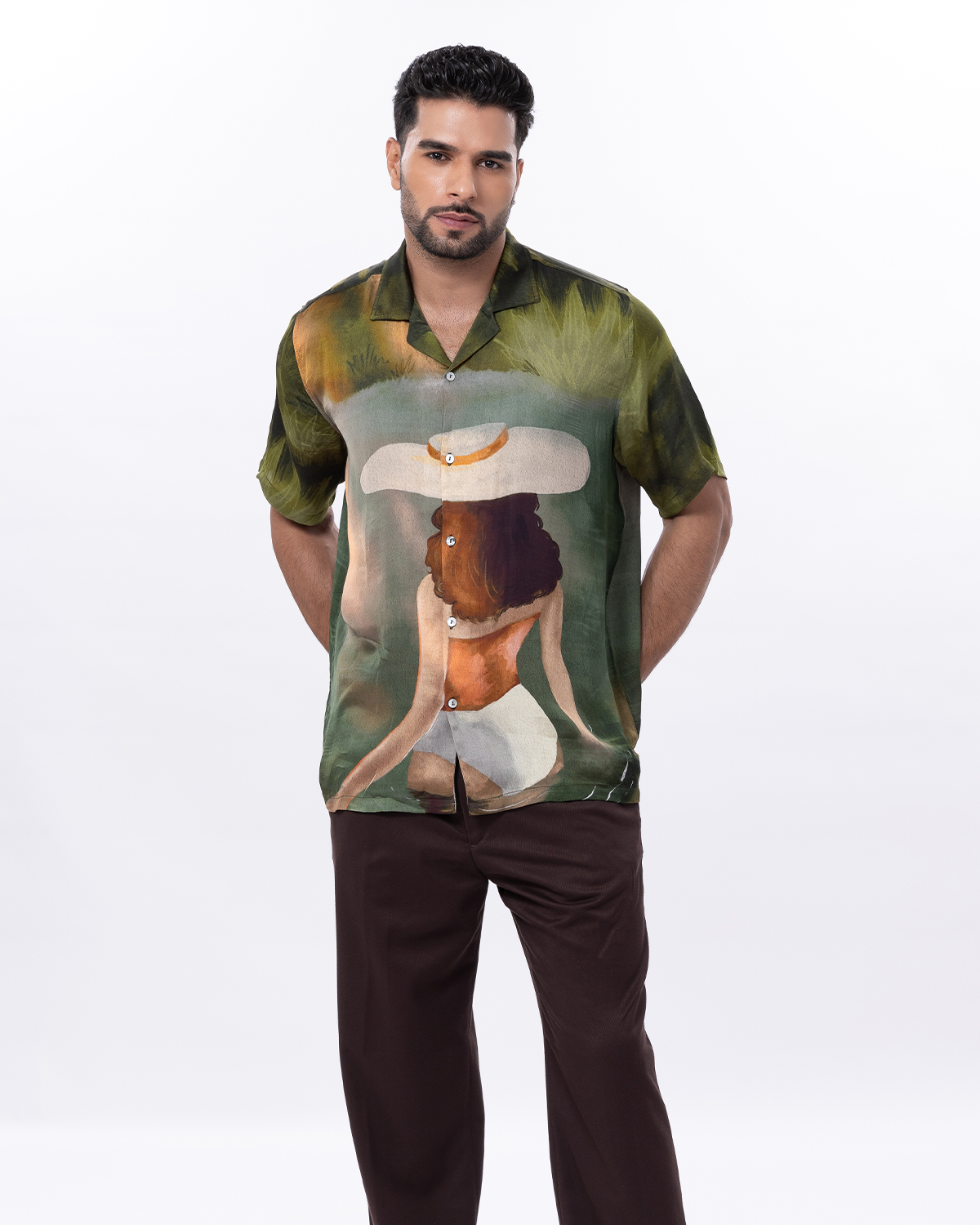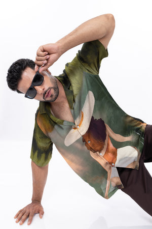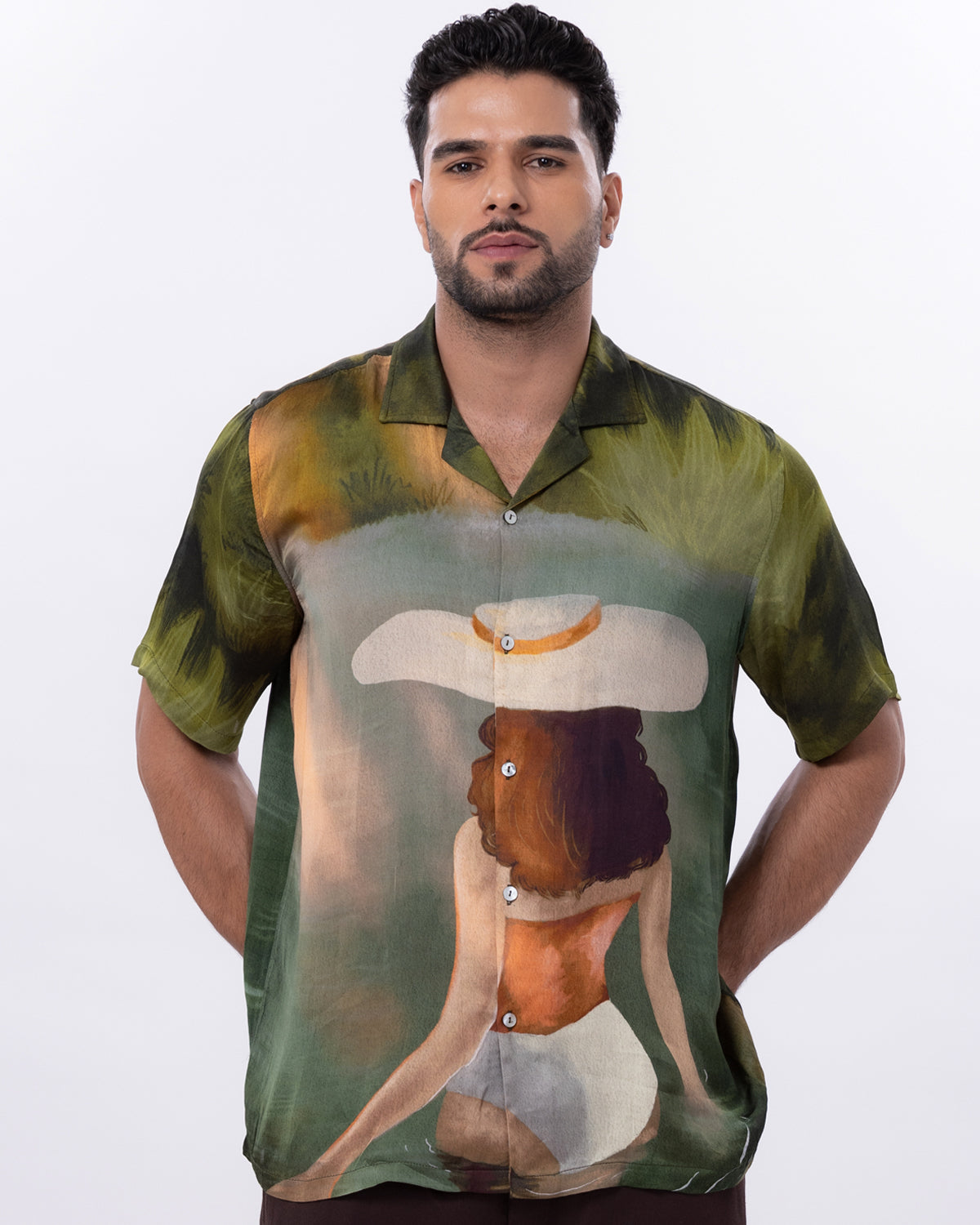 Multi color-Modal Satin-Oversized fit-Digital Printed Shirt. This exceptionally bold and poetic shirt is a stunner that covers essence of sensuality, love, and longing. Feeling a mix of emotions like a unique display of sensual poetry - from calmness to excitement, from sensuality to shyness. Every inch is like a poem, carefully crafted to make you stand out.