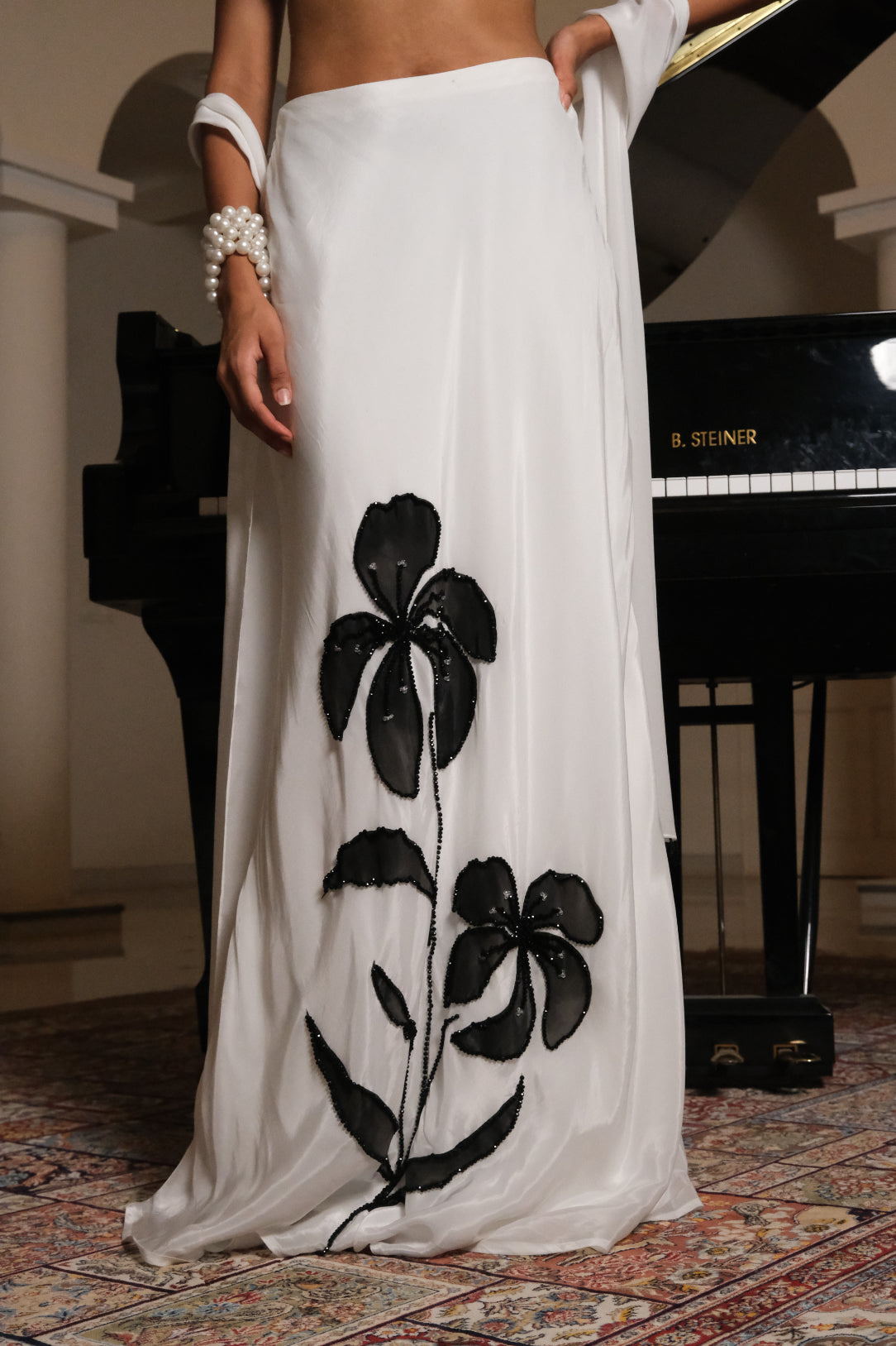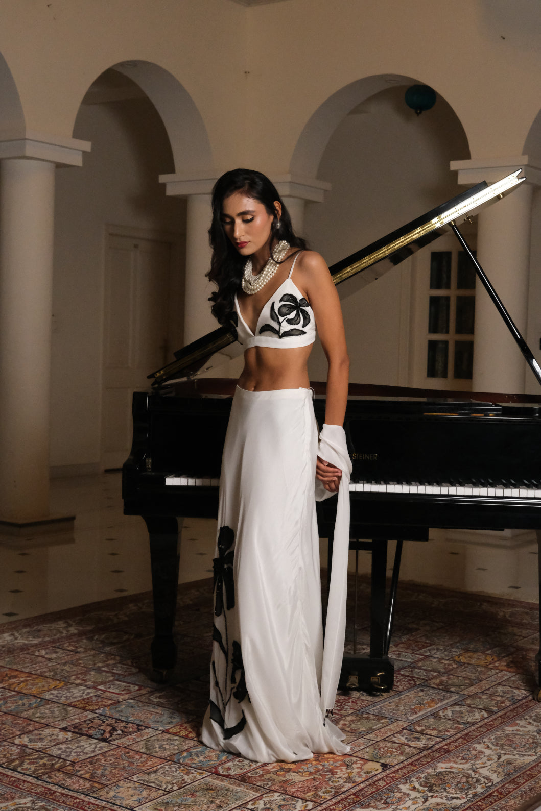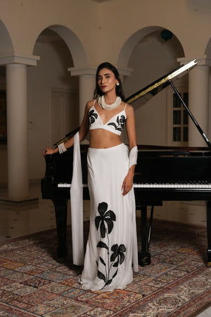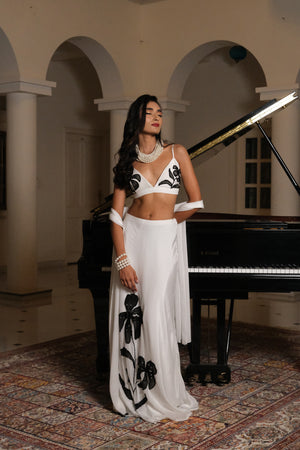 The Laila Set is a striking ensemble in pure white, featuring a sleek bralette blouse hand-painted with bold black floral motifs, highlighted with delicate crystal bead-work. Paired with a flowing skirt and a lightweight dupatta, this set blends contemporary charm with timeless elegance, making it perfect for evening soirees and special occasions.