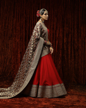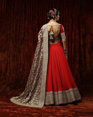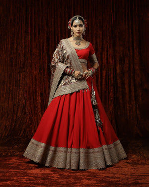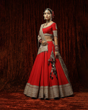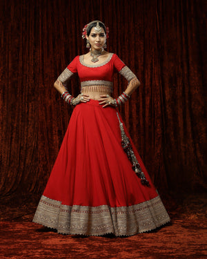 Red Silk Chanderi Plain lehenga with gota and dori border. It is paired with a Silk Chanderi blouse and georgette maroon embroided dupatta with gold detailing that give an exquisite look.