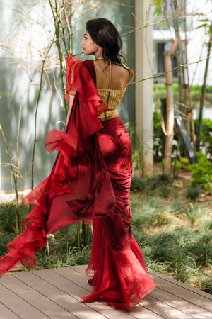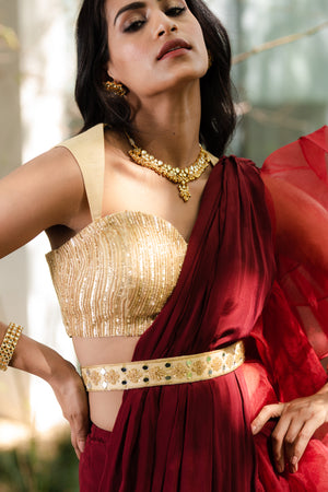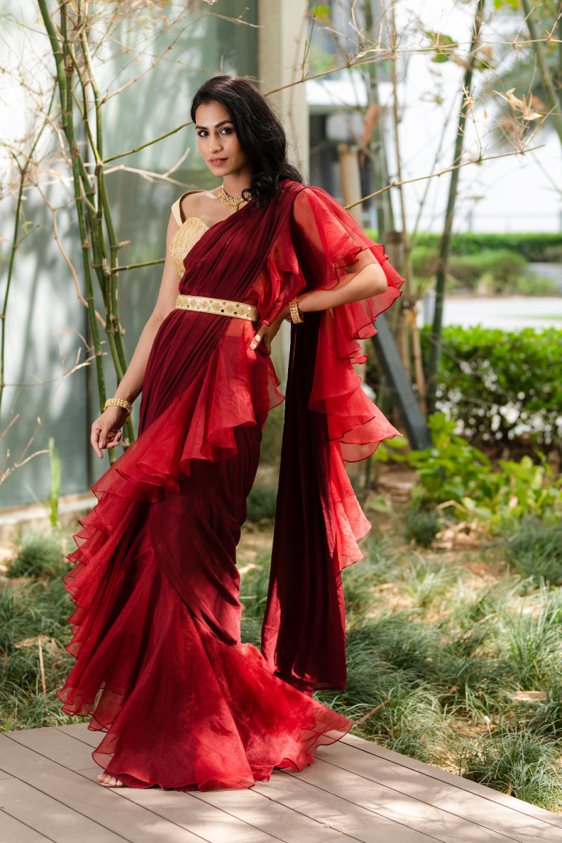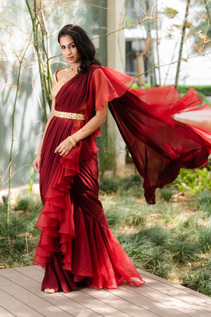 Maroon pre-draped ruffled saree with embroidered blouse and belt,
