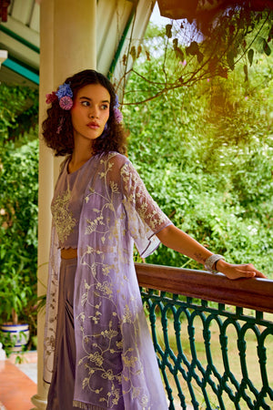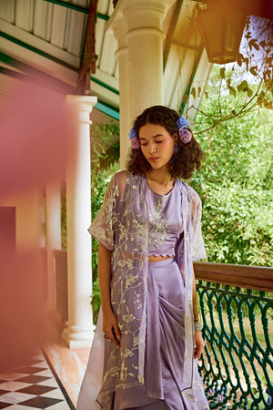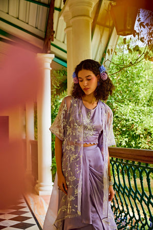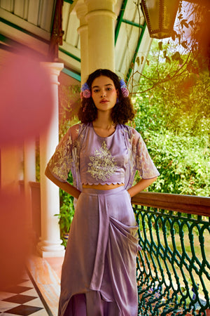 Discover elegance personified with our lavender organza jacket adorned with exquisite pearl embellishments. Paired harmoniously with a satin drape skirt and a pearl-embroidered scalloped cropped top. This ensemble defines luxury and is perfect for upscale events, weddings, and sophisticated gatherings. Elevate your style with this opulent combination that seamlessly blends tradition and contemporary allure, capturing attention and admiration effortlessly. Model Info: