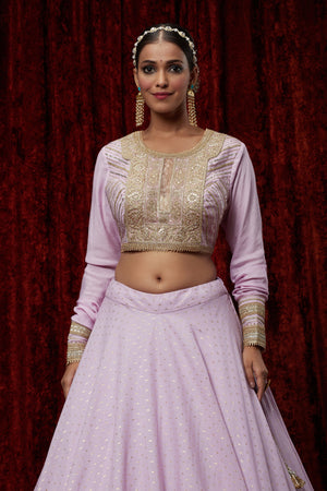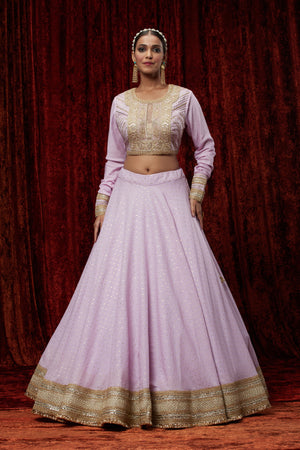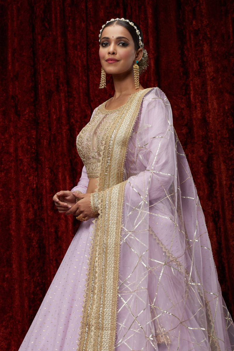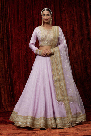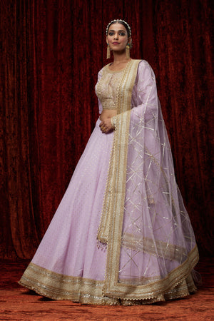 Featuring This Lavender Cotton Chanderi Lehenga With Fine Gota Work. It's Paired With Embroided Chanderi Blouse And Net Dupatta.
