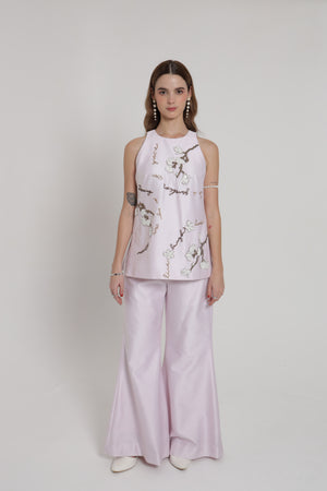 Halter neck top with wide leg pant . Hand embroidery done on the top with sequence and beads.