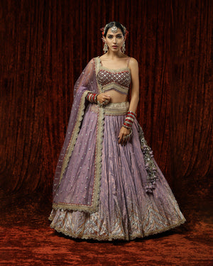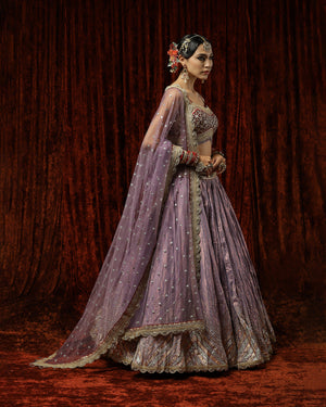 Featuring this Lavender Crinkle lahenga with fine gota work. It's paired with Maroon embroided blouse and dupatta.