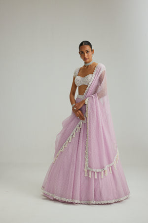 Lavender mirror and pearl lehenga set, featuring intricate mirror and pearl embroidery, paired with a heavily embroidered Cap Sleeve blouse and dupatta .