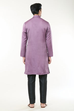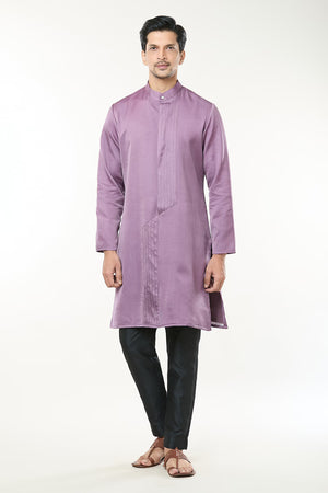 Lavender modal silk based kurta, enhanced with pintuck detailing, paired with an off white cotton silk based mexican pants.