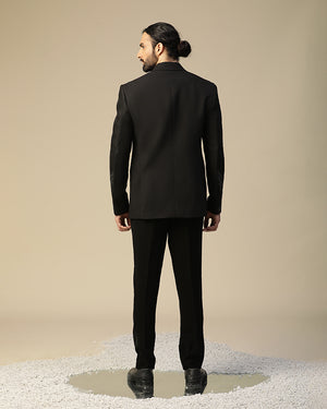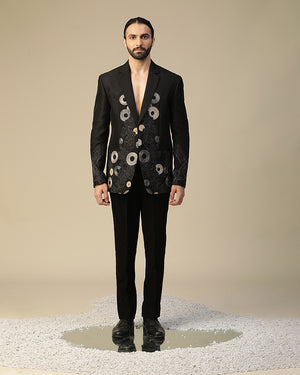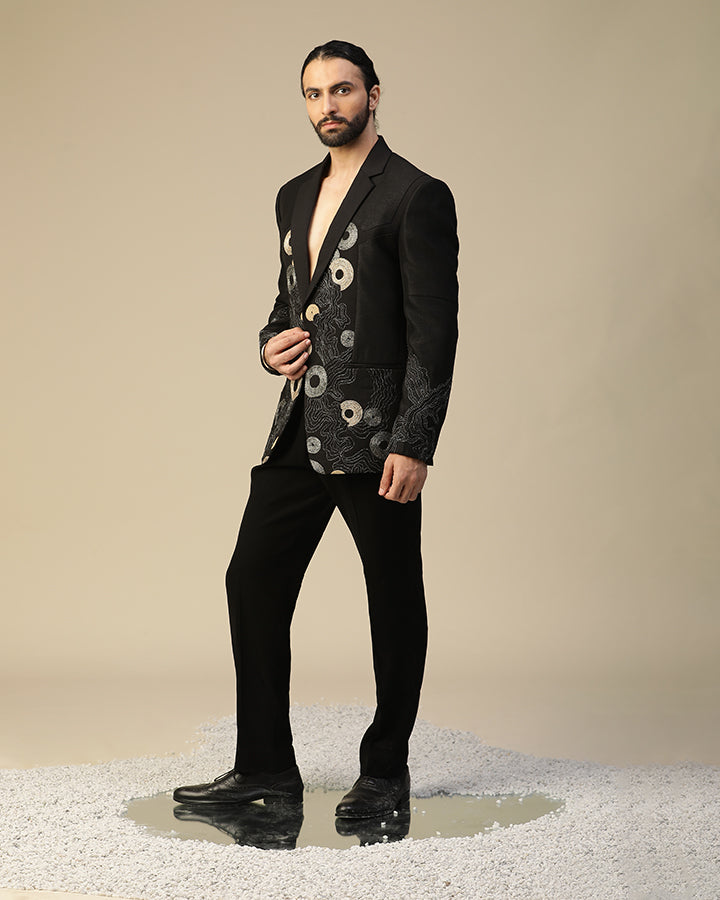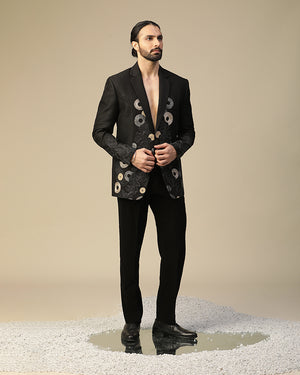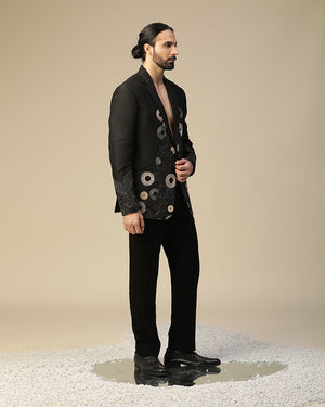 laxmi suit set in imported italian fabric with cutdaana, hand work and resham,dori embroidered round motif work on suit and plain bow. It is paired with black pintex shirt and same pants.