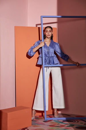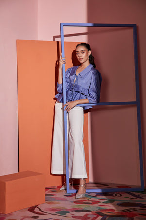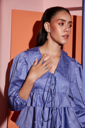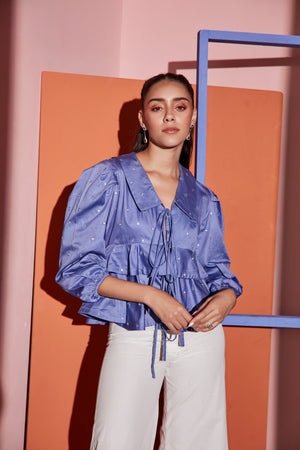Blue cotton satin double layered blouse with self thread embroidery all over the blouse