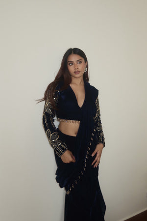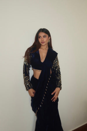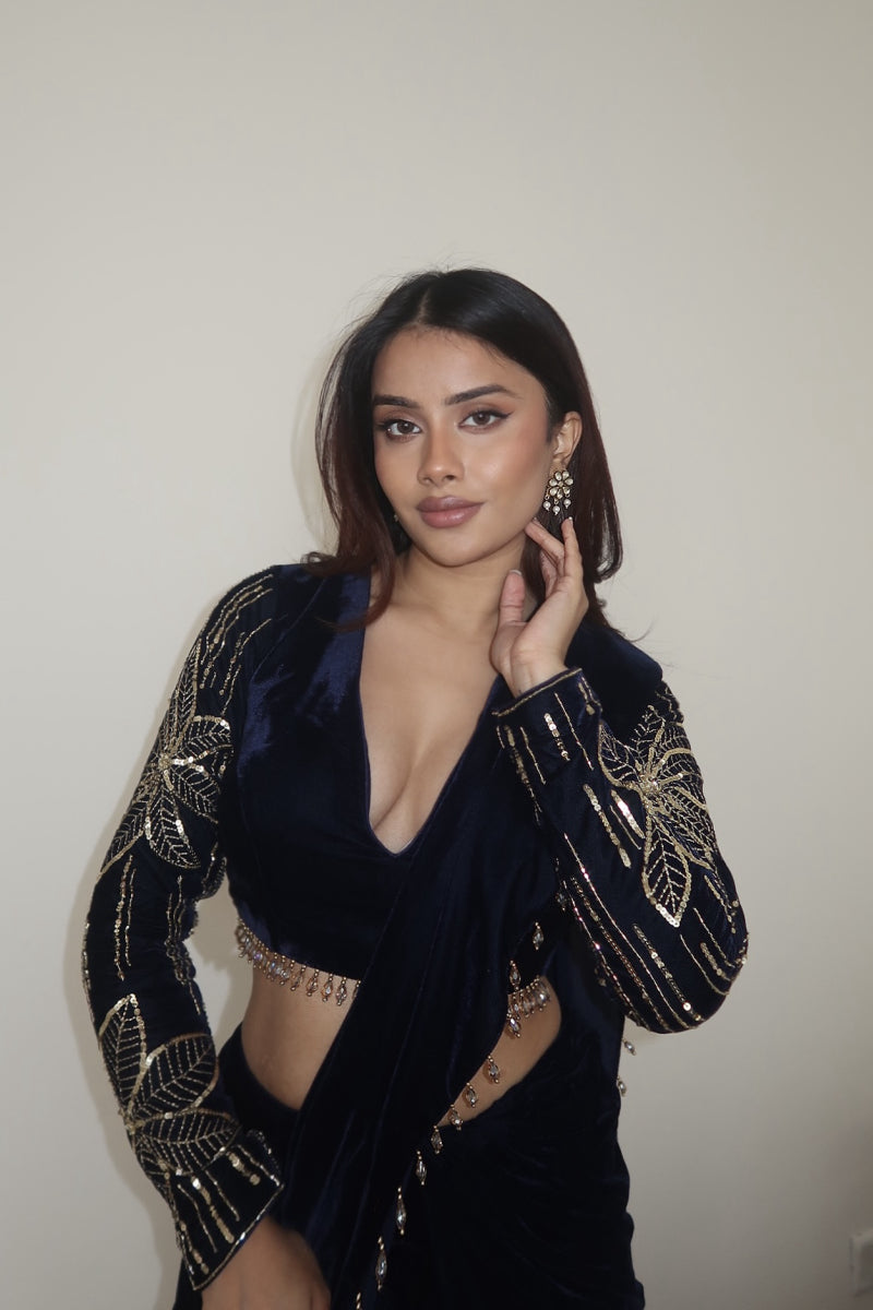 Be confident and chic in this velvet pre draped saree with embroidered sleeves!