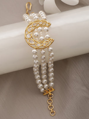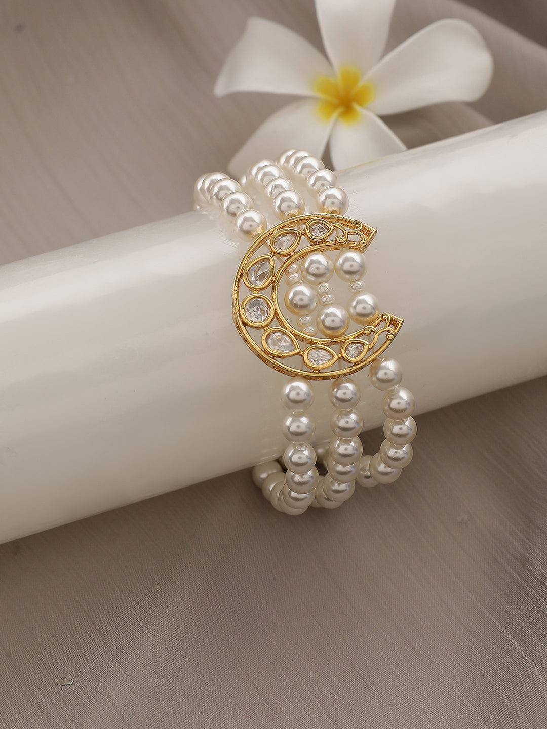 Pearl and kundan braceletThis exquisite Bracelet is crafted from pearl. Its pattern is a timeless motif that exudes elegance and sophistication, adding a luxurious touch to any outfit.This product has been crafted by hand and may have slight irregularities or imperfections in color or embellishment. These irregularities are the result of the human involvement in the process and add to the finished products charm while ensuring you have a one-of-a-kind piece.