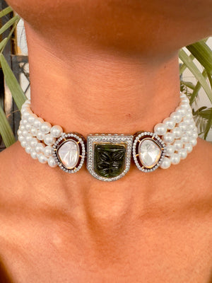Le Lindo Green And White Plated Green Kundan Studded Necklace