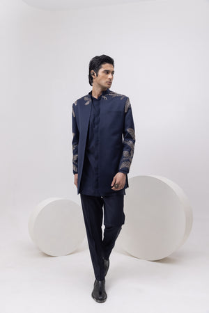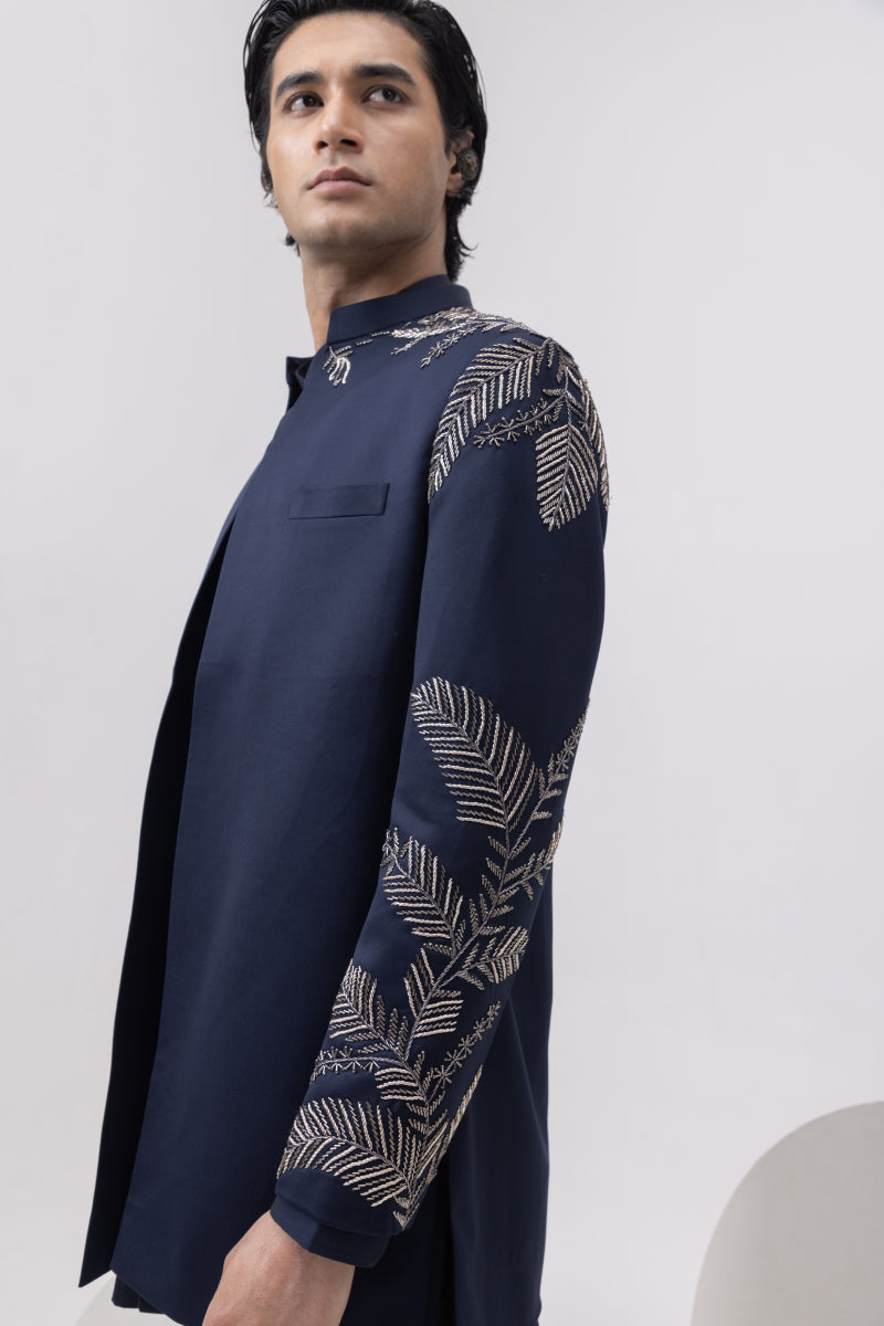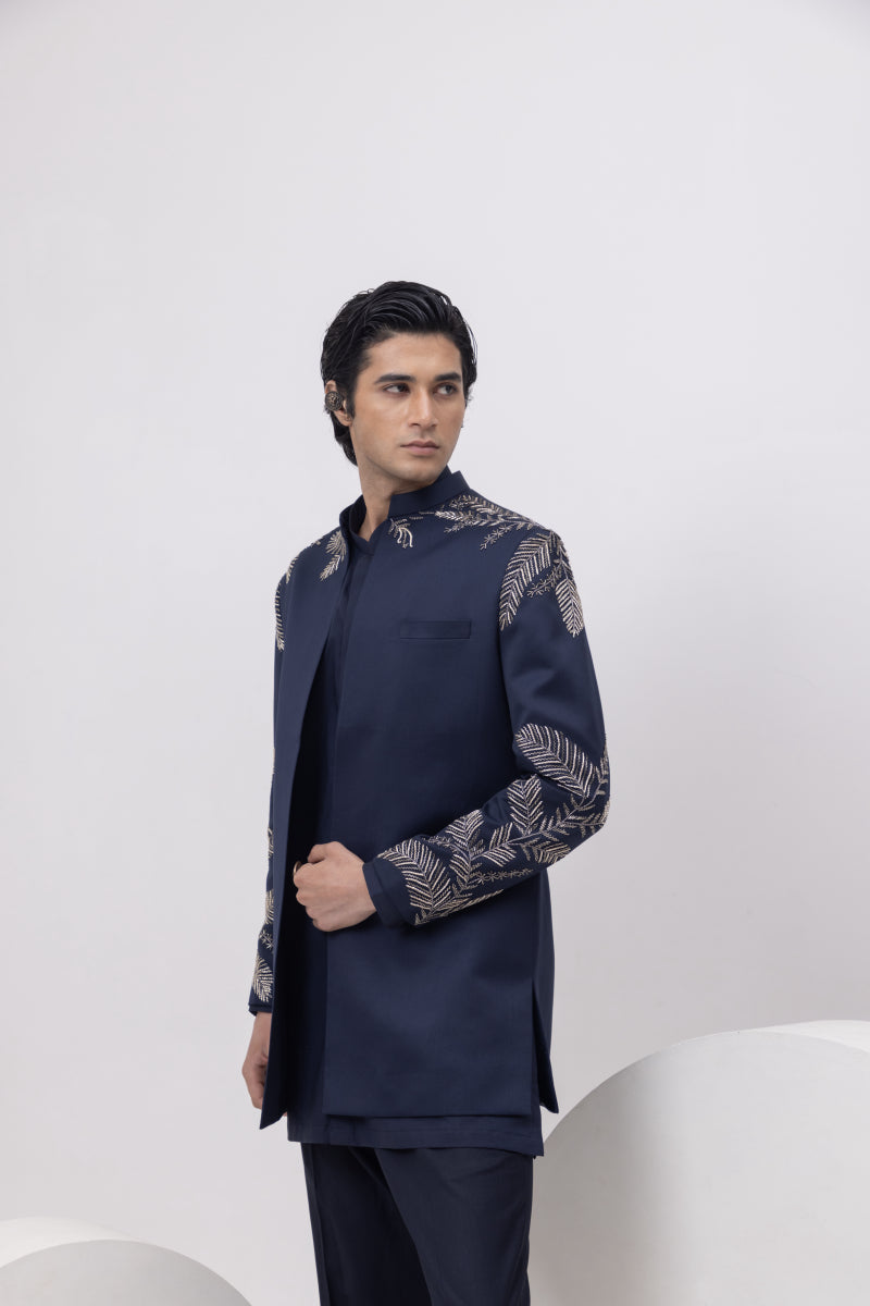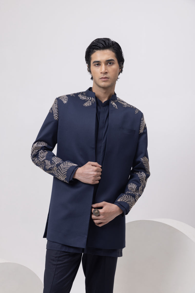This open-front short jacket is all about balanced impact, a clean silhouette elevated with bold, metallic leaf embroidery across the shoulders and sleeves. The structured cut gives it a youthful edge, while the navy hue keeps it versatile for both festive evenings and wedding functions.